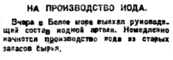 Вчера в Белое море выехал руководящий состав иодной артели. Немедленно начнется производство иода из старых запасов сырья.