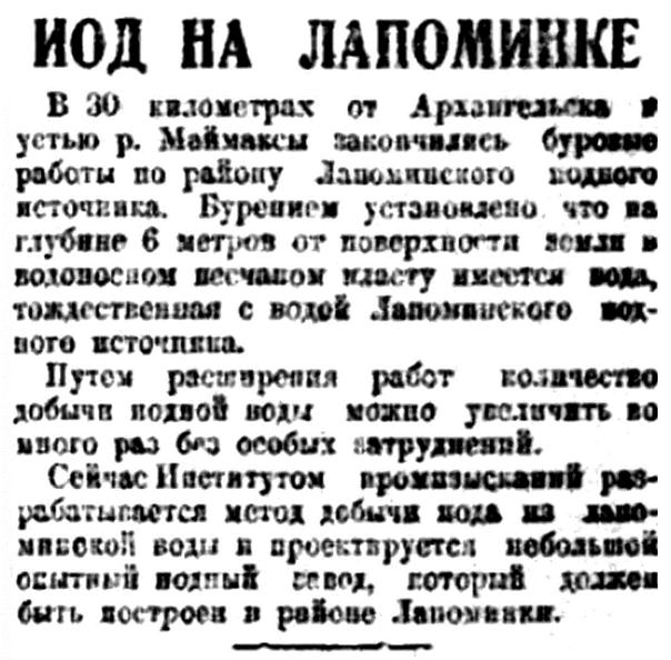 В 30 километрах от Архангельска в устье р. Маймаксы закончились буровые работы по району Лапоминского иодного источника. Бурением установлено что на глубине 6 метров от поверхности земли в водоносном песчаном пласту имеется вода, тождественная с водей Лапоминского водного источника.