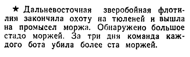 ♦ Дальневосточная зверобойная флотилия закончила охоту на тюленей и вышла на промысел моржа. Обнаружено большое стадо моржей. За три дня команда каждого бота убила более ста моржей.