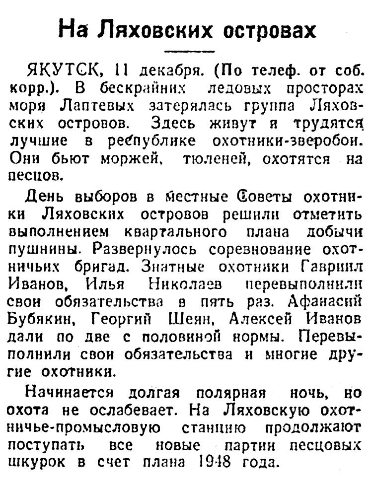 День выборов в местные Советы охотники Ляховских островов решили отметить выполнением квартального плана добычи пушнины. Развернулось соревнование охотничьих бригад. Знатные охотники Гавриил Иванов, Илья Николаев перевыполнили свои обязательства в пять раз. Афанасий Бубякин, Георгий Шеин, Алексей Иванов дали по две с половиной нормы. Перевыполнили свои обязательства и многие другие охотники.