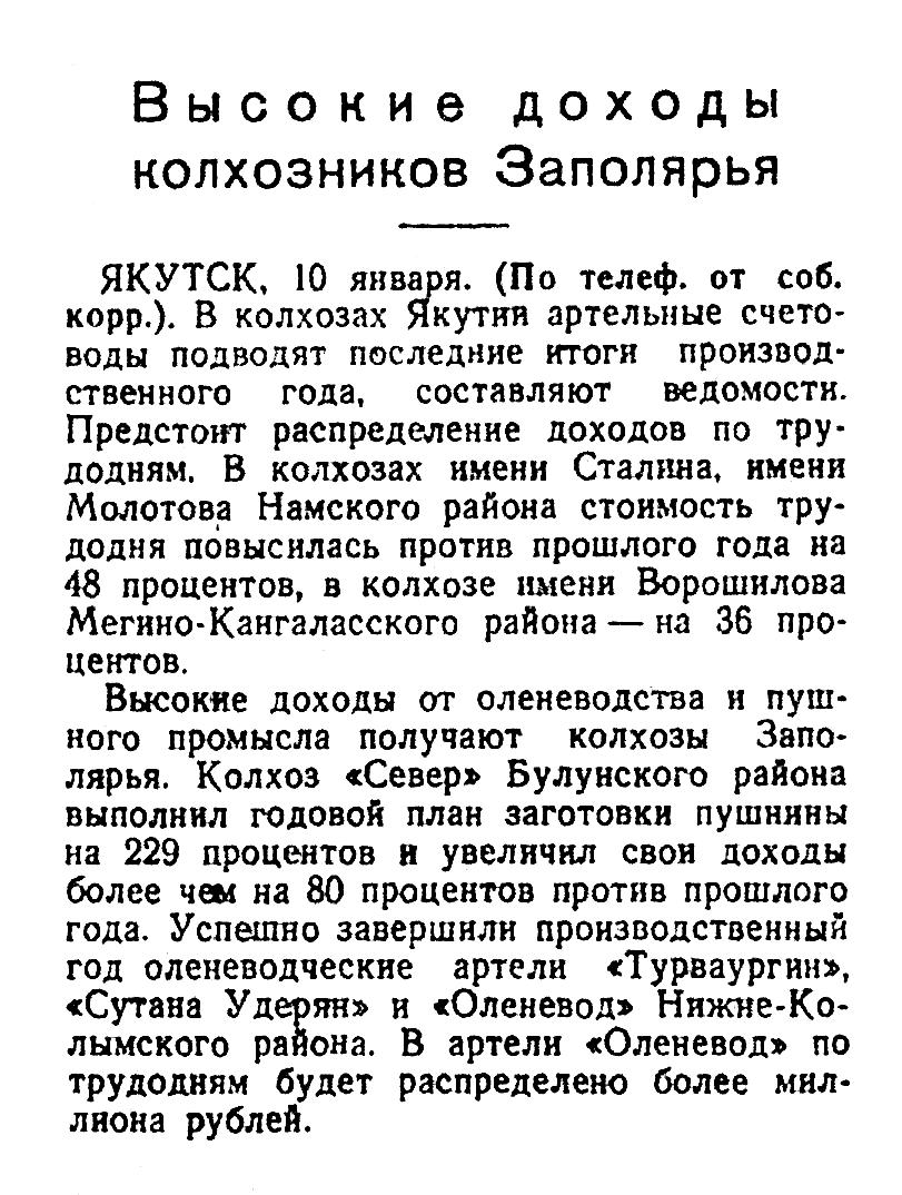 Высокие доходы от оленеводства и пушного промысла получают колхозы Заполярья. Колхоз «Север» Булунского района выполнил годовой план заготовки пушнины на 229 процентов и увеличил свои доходы более чем на 80 процентов против прошлого года. Успешно завершили производственный год оленеводческие артели «Турваургин», «Сутана Удерян» и «Оленевод» Нижне-Колымского района. В артели «Оленевод» по трудодням будет распределено более миллиона рублей.