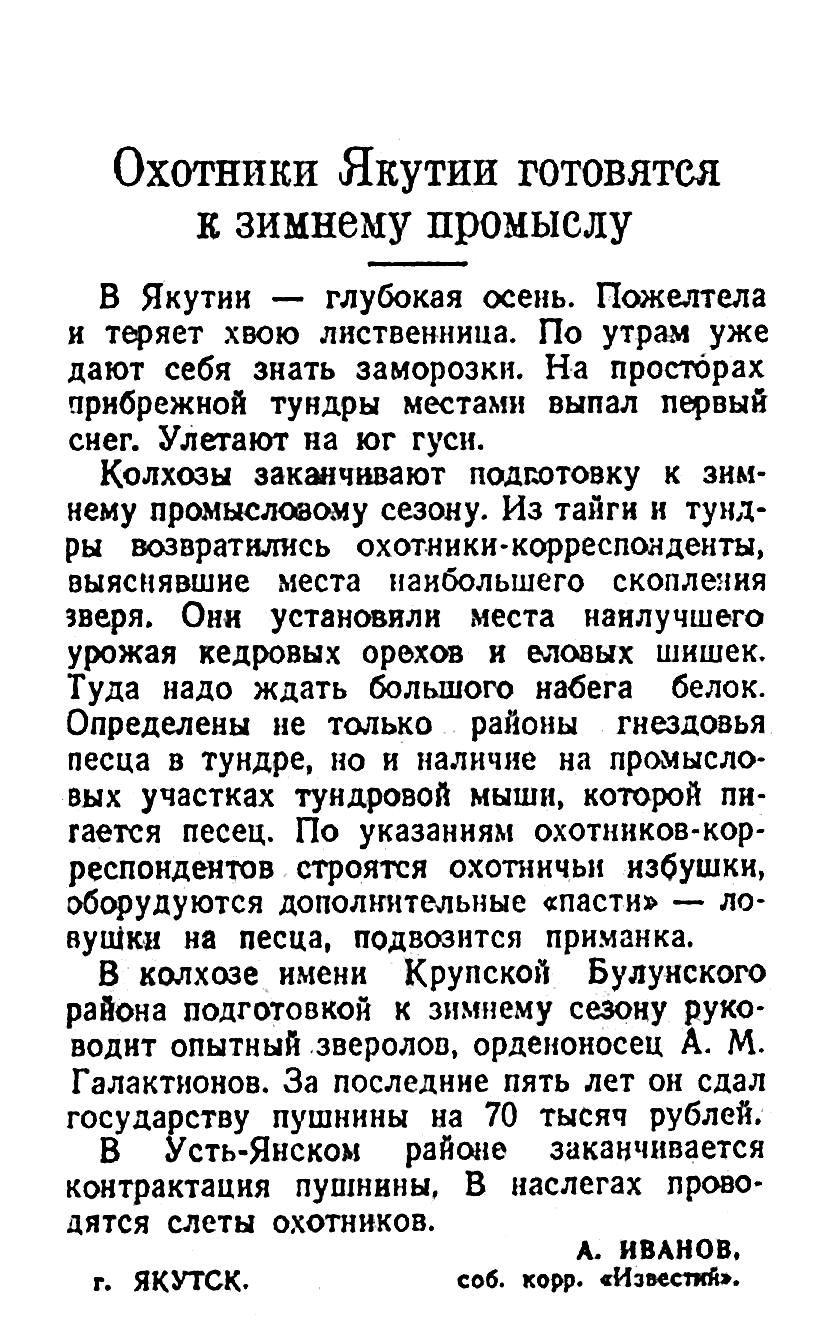 В колхозе имени Крупской Булунского района подготовкой к зимнему сезону руководит опытный зверолов, орденоносец А. М. Галактионов. За последние пять лет он сдал государству пушнины на 70 тысяч рублей.
