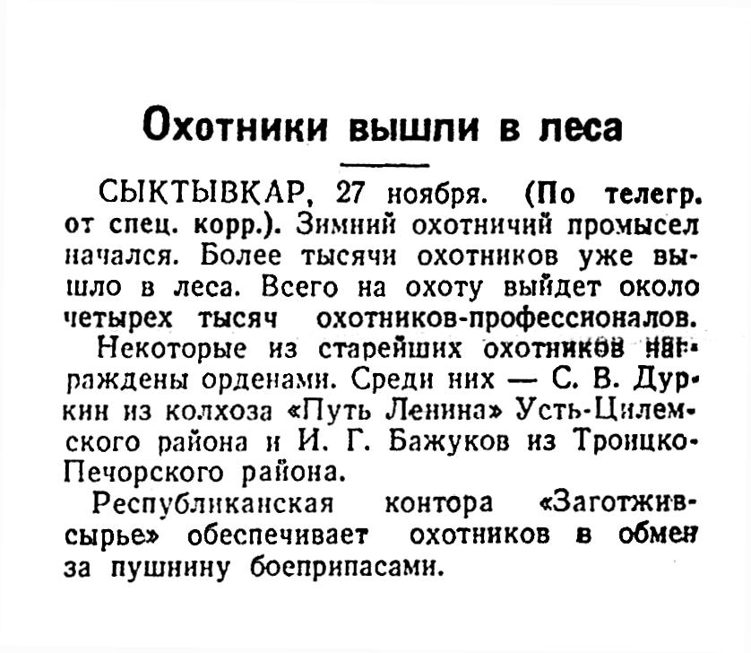 Некоторые из старейших охотников награждены орденами. Среди них — С. В. Дуркин из колхоза «Путь Ленина» Усть-Цилемского района и И. Г. Бажуков из Троицко-Печорского района.