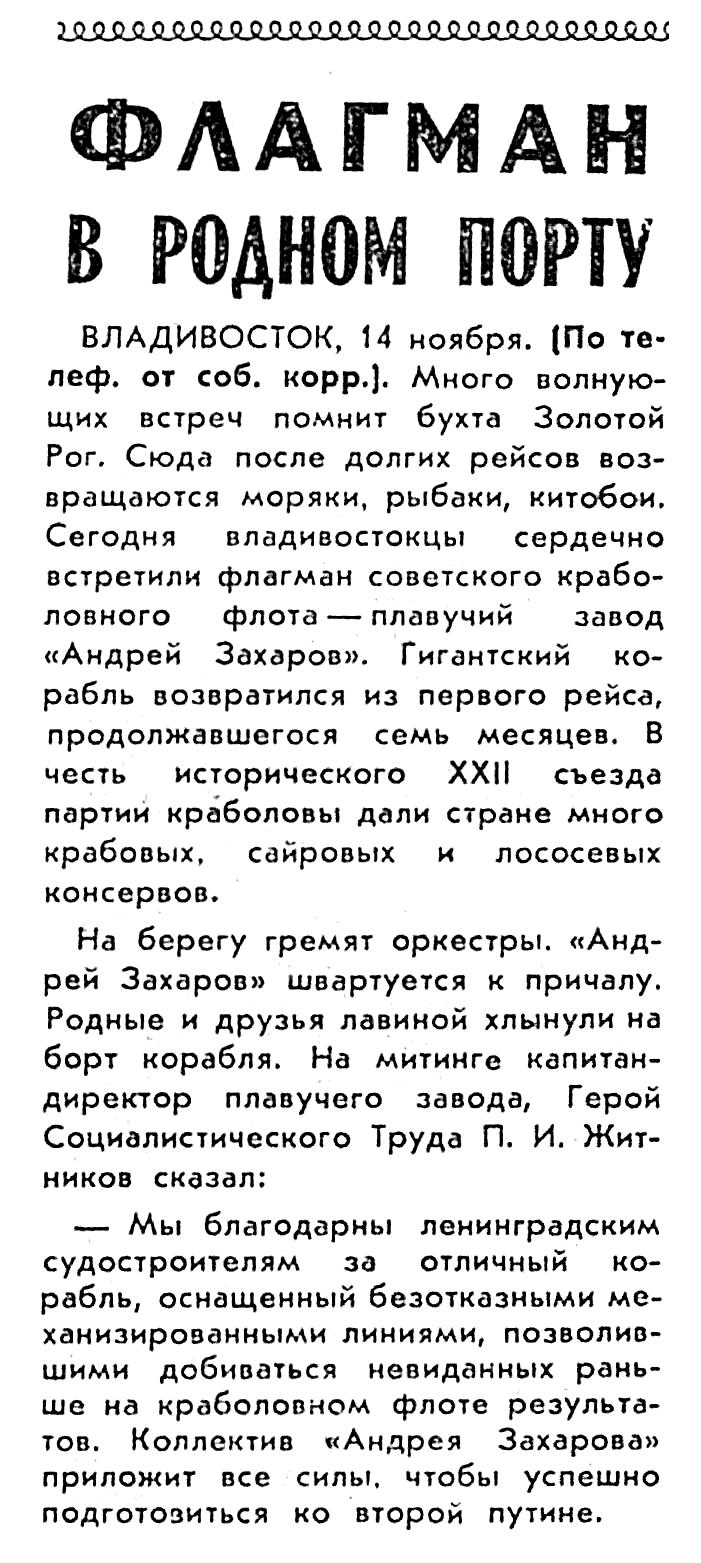 ВЛАДИВОСТОК, 14 ноября. (По телеф. от соб. корр.). Много волнующих встреч помнит бухта Золотой Рог. Сюда после долгих рейсов возвращаются моряки, рыбаки, китобои. Сегодня владивостокцы сердечно встретили флагман советского краболовного флота — плавучий завод «Андрей Захаров». Гигантский корабль возвратился из первого рейса, продолжавшегося семь месяцев. В честь исторического XXII съезда партии краболовы дали стране много крабовых, сайровых и лососевых консервов.