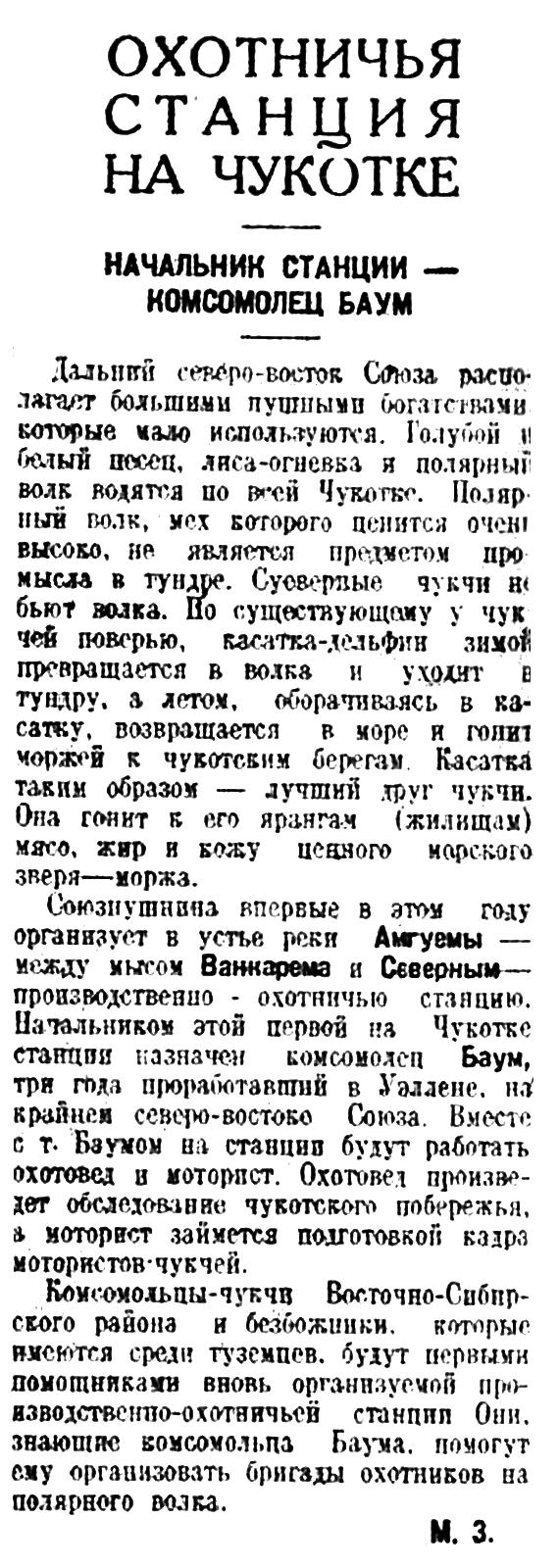 Комсомольцы-чукчи Восточно-Сибирского района и безбожники, которые имеются среди туземцев, будут первыми помощниками вновь организуемой производственно-охотничьей станции. Они, знающие комсомольца Баума, помогут ему организовать бригады охотников на полярного волка.