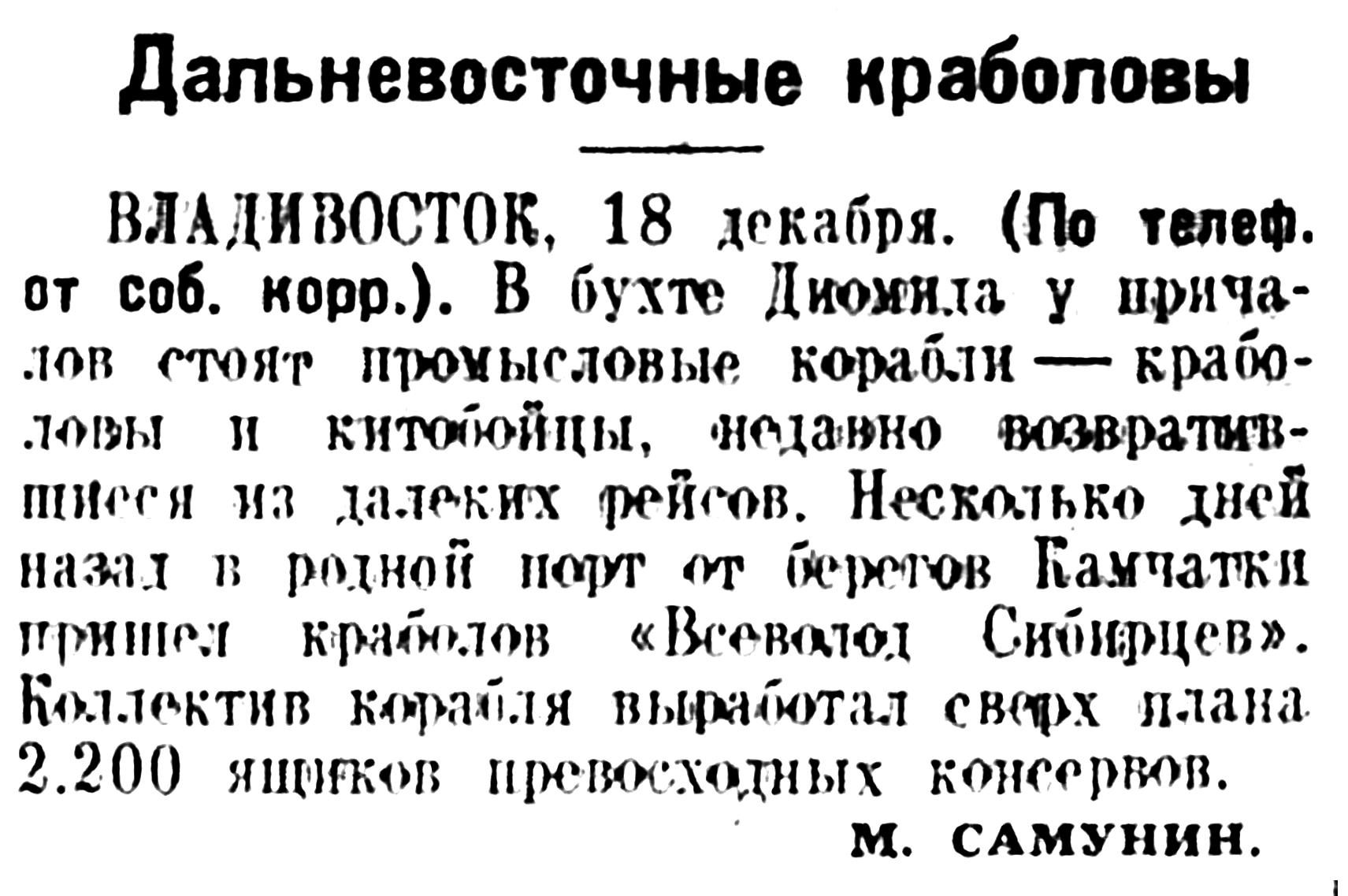 Известия, 1951, № 295 (10753), 19 декабря.Дальневосточные краболовы