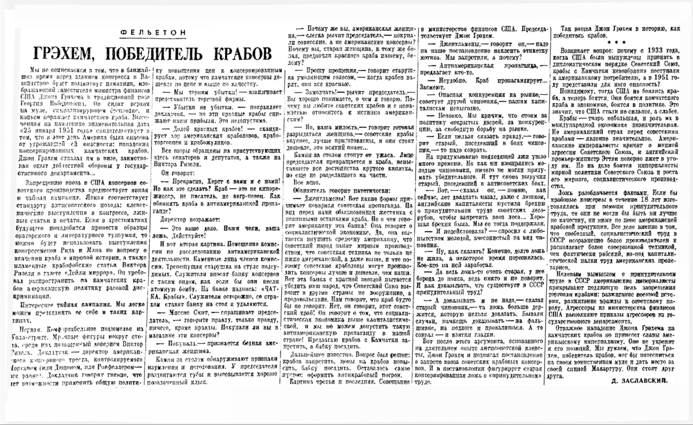 5 марта 1951 года в «Правде» был напечатан фельетон журналиста Д. Заславского «Грэхем, победитель крабов».