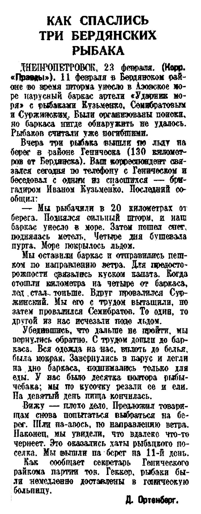 Из селения Чевтун вскоре ожидают прибытия последних шести охотников, среди которых находится председатель науканского нацсовета т. Утойк. Зверобои передали по радио горячий привет товарищу Сталину, ЦК ВКП(б), СНК СССР и начальнику Главсевморпути О. Ю. Шмидту.