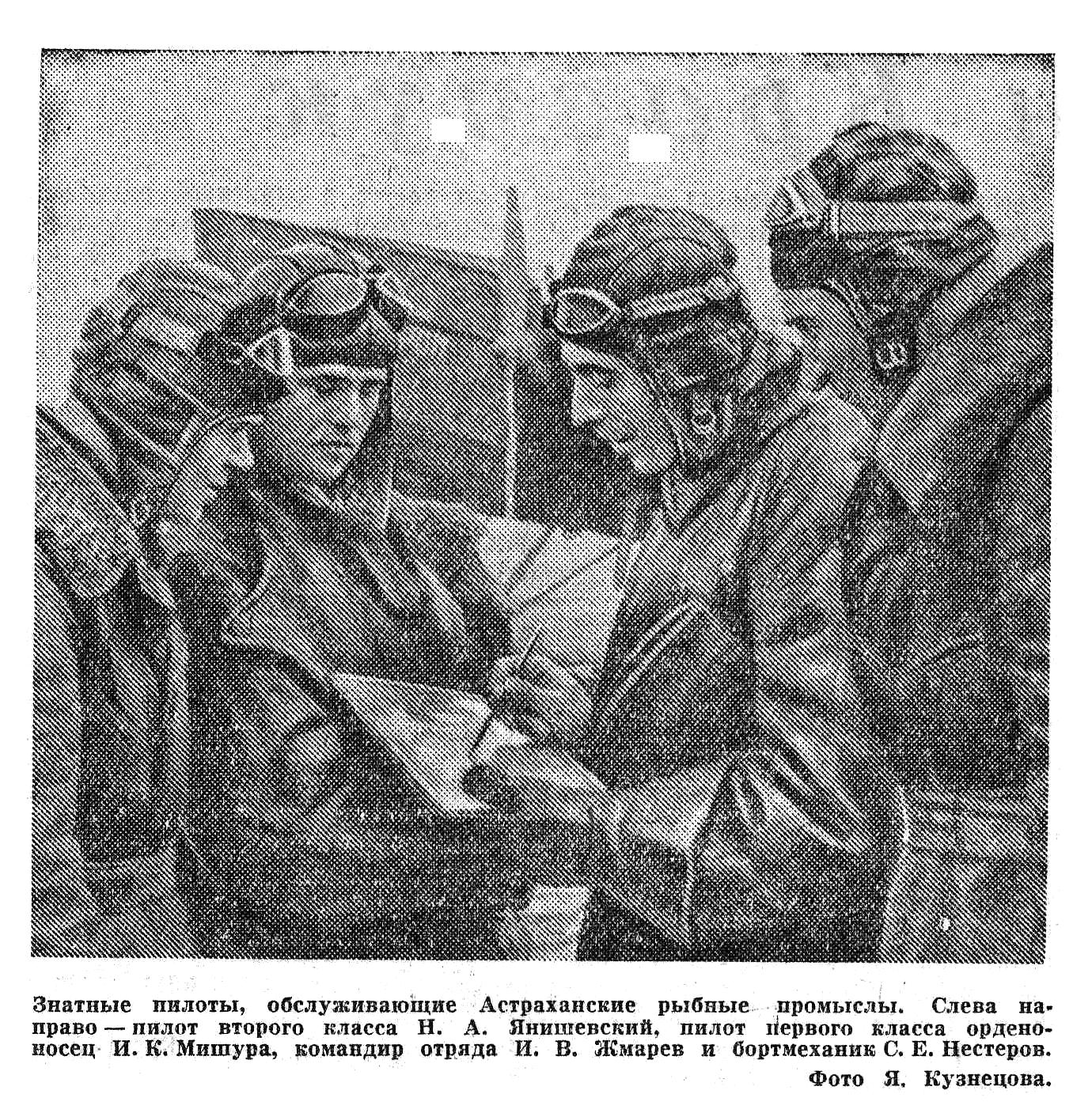 Известия, 1940, № 71 (7143), 27 марта.Знатные пилоты, обслуживающие Астраханские рыбные промыслы. Слева направо — пилот второго класса