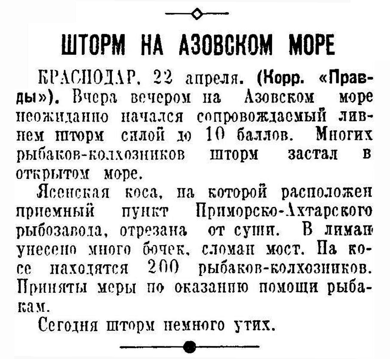 Ясенская коса, на которой расположен приемный пункт Приморско-Ахтарского рыбозавода, отрезана от суши. В лиман унесено много бочек, сломан мост. На косе находятся 200 рыбаков-колхозников. Приняты меры по оказанию помощи рыбакам.