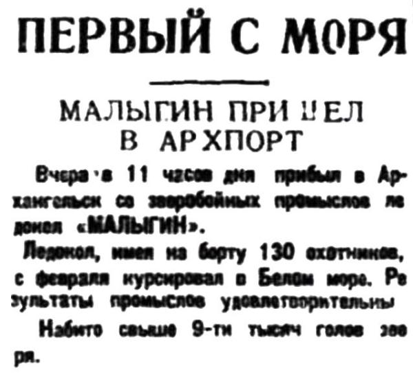Ледокол, имея на борту 130 охотников, с февраля курсировал в Белом море. Результаты промыслов удовлетворительны.
