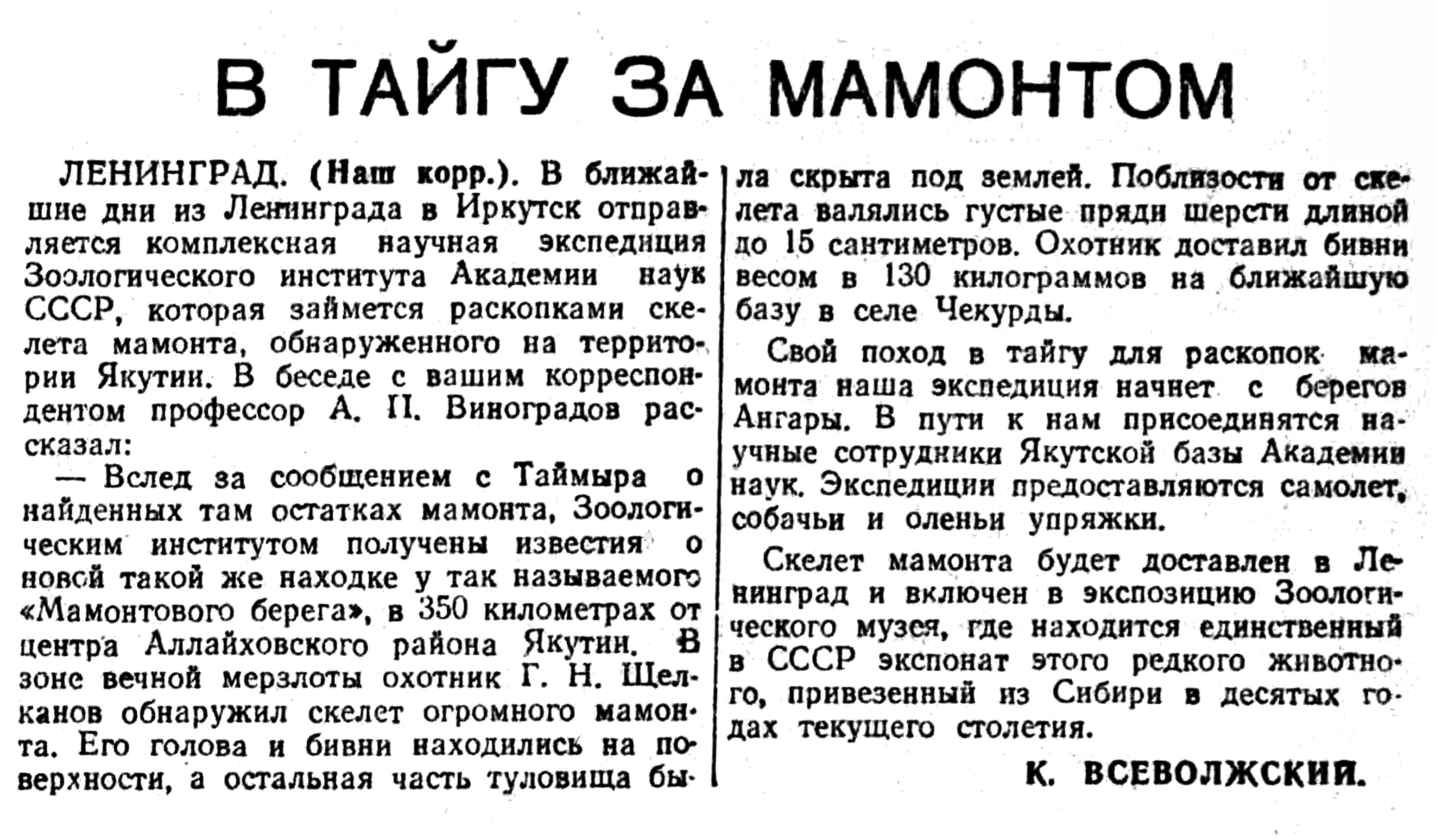 Осенью 1948 года Зоологический институт Академии Наук СССР получил известие о нахождении трупа мамонта на северо-западном берегу Таймырского полуострова, а позже в Палеонтологический институт был доставлен бивень его, фотографии черепа с другим бивнем и получены сведения о вероятном нахождении всего трупа в нераскопанной части почвы. Это и вызвало посылку экспедиции, которая в конце мая 1949 года прибыла на северный берег Таймырского полуострова, а 15 июля начала раскопки на речке Мамонтовой, где под высоким навалом мерзлого снега лежал труп; три дня продолжались его раскопки, пока не вскрыли череп с одним бивнем и отдельные кости в галечном наносе. Осторожными раскопками вскрыты часть костей, но затем потепление вызвало угрозу затопления места половодьем речки. Пришлось засыпать пройденную в наносе шахту, чтобы сохранить наносы от размыва.