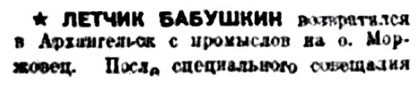 ЛЕТЧИК БАБУШКИН возвратился в Архангельск с помыслов на о. Моржовец. После специального совещания при тресте зверобойных промыслов, где будут подведены итоги работ аэропланов, летчики Бабушкин и Дедущенко (находящийся уже в Архангельске) возвратятся на своих самолетах в Москву.