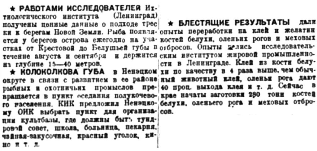 КОЛОКОЛКОВА ГУБА в Ненецком округе в связи с развитием в ее районе рыбных и охотничьих промыслов превращается в пункт оседания полукочевого населения. КИК предложил Ненецкому ОИК выбрать пункт для организации культбазы, где должны быть тундровой совет, школа, больница, пекарня, чайная-закусочная, красный уголок, кино и т. д.