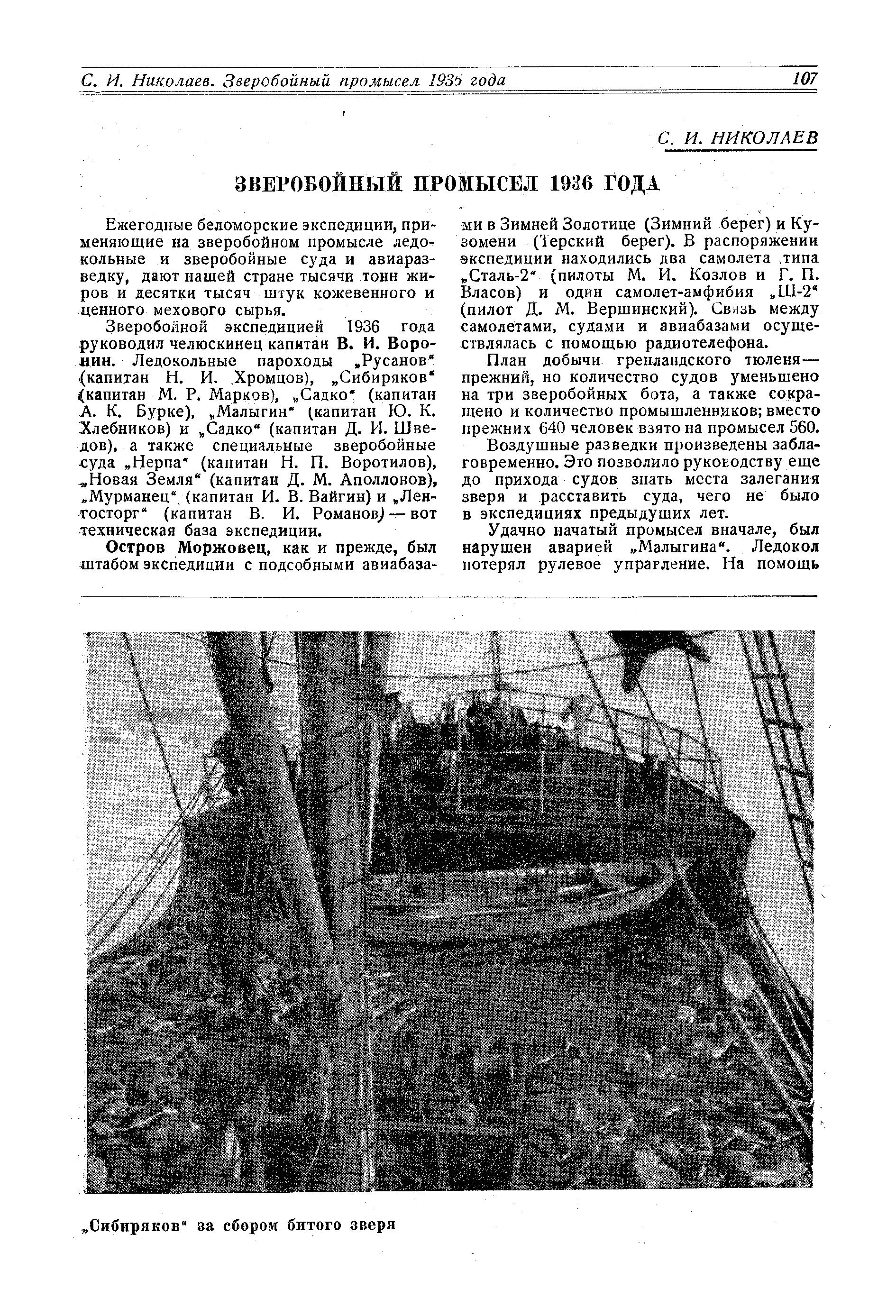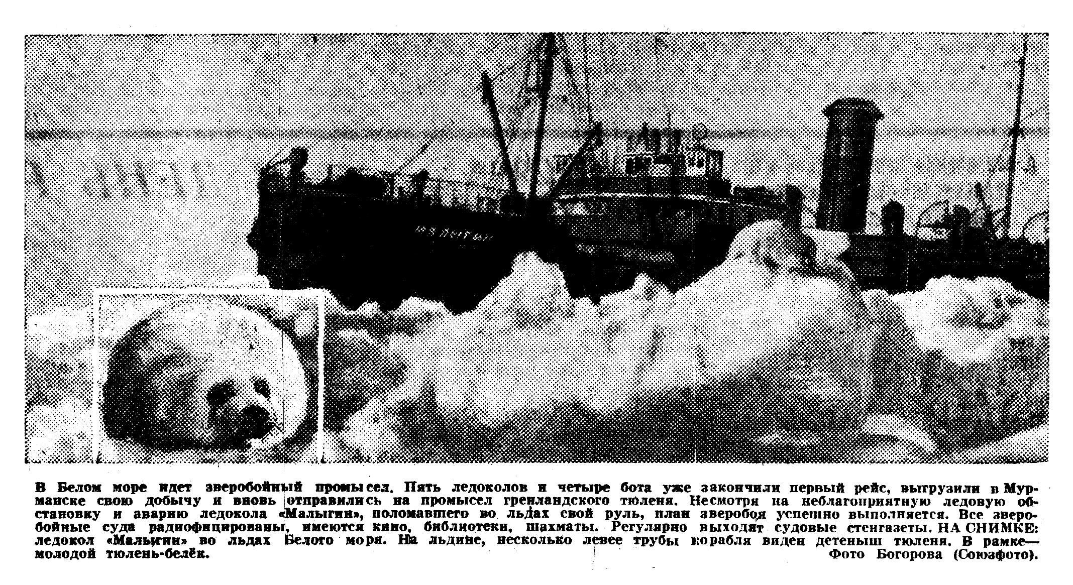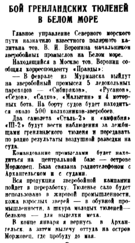 О. Ю. Шмидта в августе 1935 г. вся научно-исследовательская работа по северному морскому зверю, в том числе и по беломорскому лысуну (гренландскому тюленю) передана Арктическому институту. В связи с этим институт разработал план и программу изучения этого важнейшего объекта советского зверобойного промысла и в феврале текущего года снарядил первую экспедицию. Конечная задача предпринятых исследований заключается в том, чтобы ввести беломорский промысел гренландского тюленя в русло правильного промыслового хозяйства.