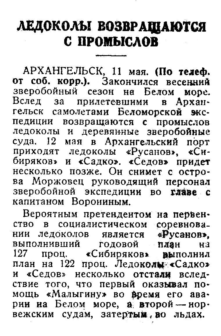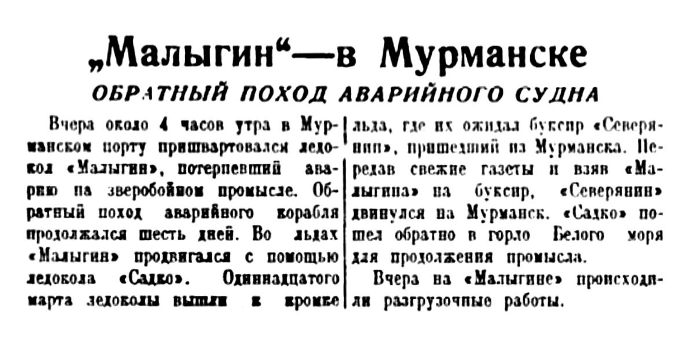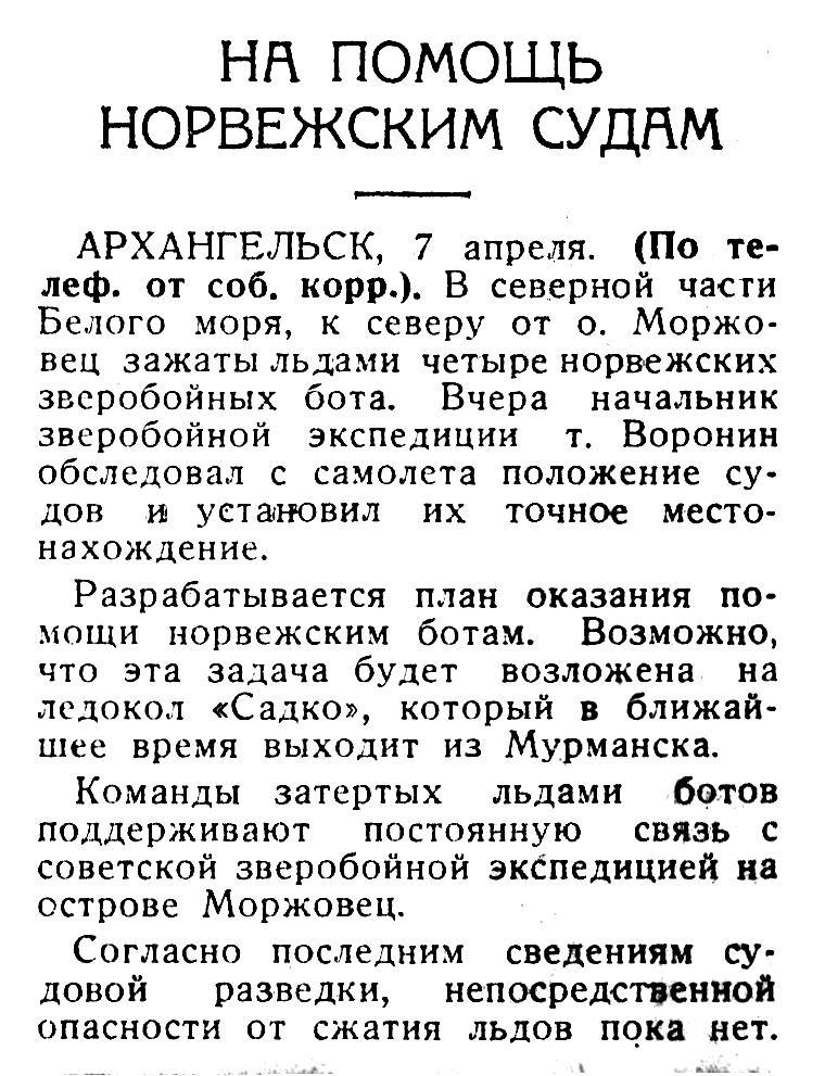Сообщение авиаразведки о нахождении новой небольшой детной залежки не подтвердилось тщательными десятидневными поисками ее (с 13 по 24 марта) л/к "Садко". Самолет ошибочно указывал на детную залежку, принимая ее за небольшую группу самцов, которые уже начинали скапливаться на линные залежки.