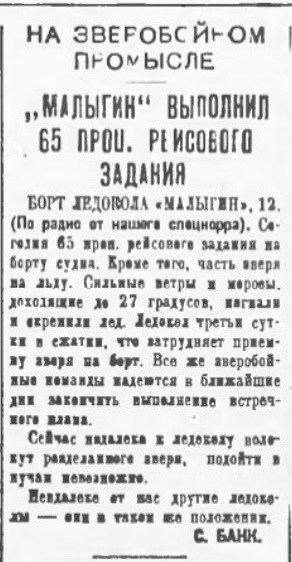 Архангельским управлением Севморпути подведены итоги зверобойной кампании. Общий план по добыче морского зверя выполнен на 100,26 проц. Из судов лучшие результаты имеет «Садко» под командой капитана Хромцева, он свое задание выполнил на 134,5 процента, ледокольный пароход «Русанов» план выполнил на 116 процентов.
