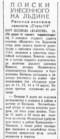 БОРТ ЛЕДОКОЛА «МАЛЫГИН». 15. (По радио от нашего корреспондента). С помощью старшего радиста ледокола «Малыгин» тов. Харламова вчера днем удалось провести радиобеседу с экипажем самолета «СТАЛЬ-114», входящем а авиаотряд зверобойной экспедиции. Команда самолета в составе старшего аэронавигатора капитана дальнего плавания Крюкова, летчика Вершинского, аэронавигатора Пономарева и бортмеханика Нелидова рассказала о розысках унесенного на льдине промышленника (см. «Полярную правду» от 11, 12, 14 и 16 марта). Передаю краткое содержание их рассказа: