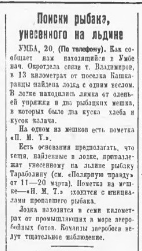 Мы предполагаем, что промышленники старался попасть на берег, но вследствие ледяной шуги и шторма и по своей неопытности погиб. Наше предположение подтверждается еще и тем, что, по слухам, 10 марта в районе Кузомень — Кашкаранцы видели распущенных оленей. Надо учесть, что при наличии движущихся льдов опытный промышленник мог бы добраться до ледоколов, которые находятся близко от берега. Все же поиски унесенного на льдине будем продолжать.