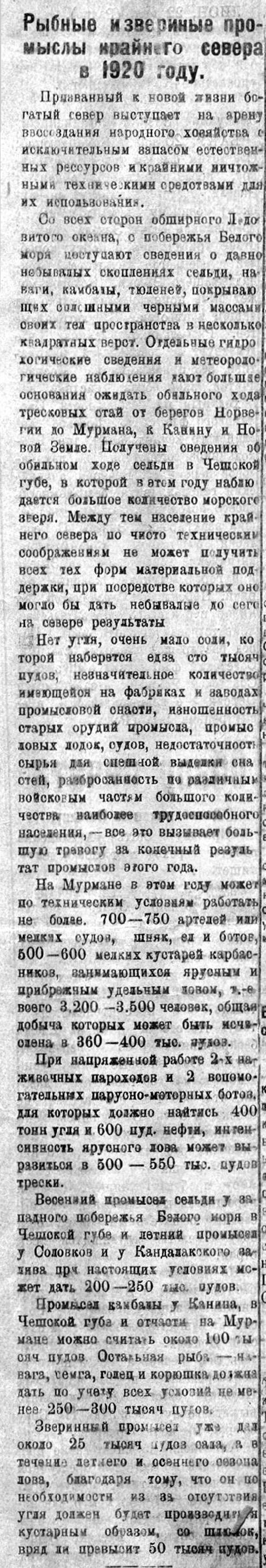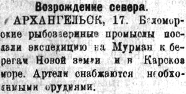 Со всех сторон обширного Ледовитого океана, с побережья Белого моря поступают сведения о давно небывалых скоплениях сельди, наваги, камбалы, тюленей, покрывающих сплошными черными массами своих тел пространства в несколько квадратных верст. Отдельные гидрологические сведения и метеорологические наблюдения дают большие основания ожидать обильного хода тресковых стай от берегов Норвегии до Мурмана, к Канину и Новой Земле. Получены сведения об обильном ходе сельди в Чешской губе, в которой в этом году наблюдается большое количество морского зверя. Между тем население крайнего севера по чисто техническим соображениям не может получить всех тех форм материальной поддержки, при посредстве которых оно могло бы дать небывалые до сего на севере результаты.