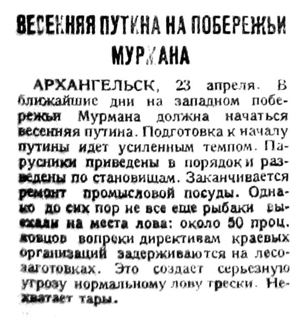 АРХАНГЕЛЬСК, 23 апреля. В ближайшие дни на западном побережьи Мурмана должна начаться весенняя путина. Подготовка к началу путины идет усиленным темпом. Парусники приведены в порядок и разведены по становищам. Заканчивается ремонт промысловой посуды. Однако до сих пор не все еще рыбаки выехали на места лова: около 50 проц. ловцов вопреки директивам краевых организаций задерживаются на лесозаготовках. Это создаст серьезную угрозу нормальному лову трески. Нехватает тары.