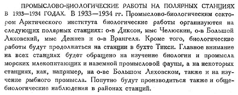 ПРОМЫСЛОВО-БИОЛОГИЧЕСКИЕ РАБОТЫ НА ПОЛЯРНЫХ СТАНЦИЯХ В 1933—1934 ГОДАХ. В 1933—1934 гг. Промыслово-биологическим сектором Арктического института биологические работы организуются на следующих полярных станциях: о-в Диксон, мыс Челюскин, о-в Большой Ляховский, мыс Дежнев и о-в Врангеля. Кроме того, биологические работы будут продолжаться на станции в бухте Тикси. Главное внимание на всех станциях будет обращено на изучение биологии и промысла морских млекопитающих и наземной промысловой фауны, а на некоторых станциях, как, например, на о-ве Большом Ляховском, также и на изучение рыбного промысла. Попутно будут производиться также и общебиологические наблюдения в районах станций.