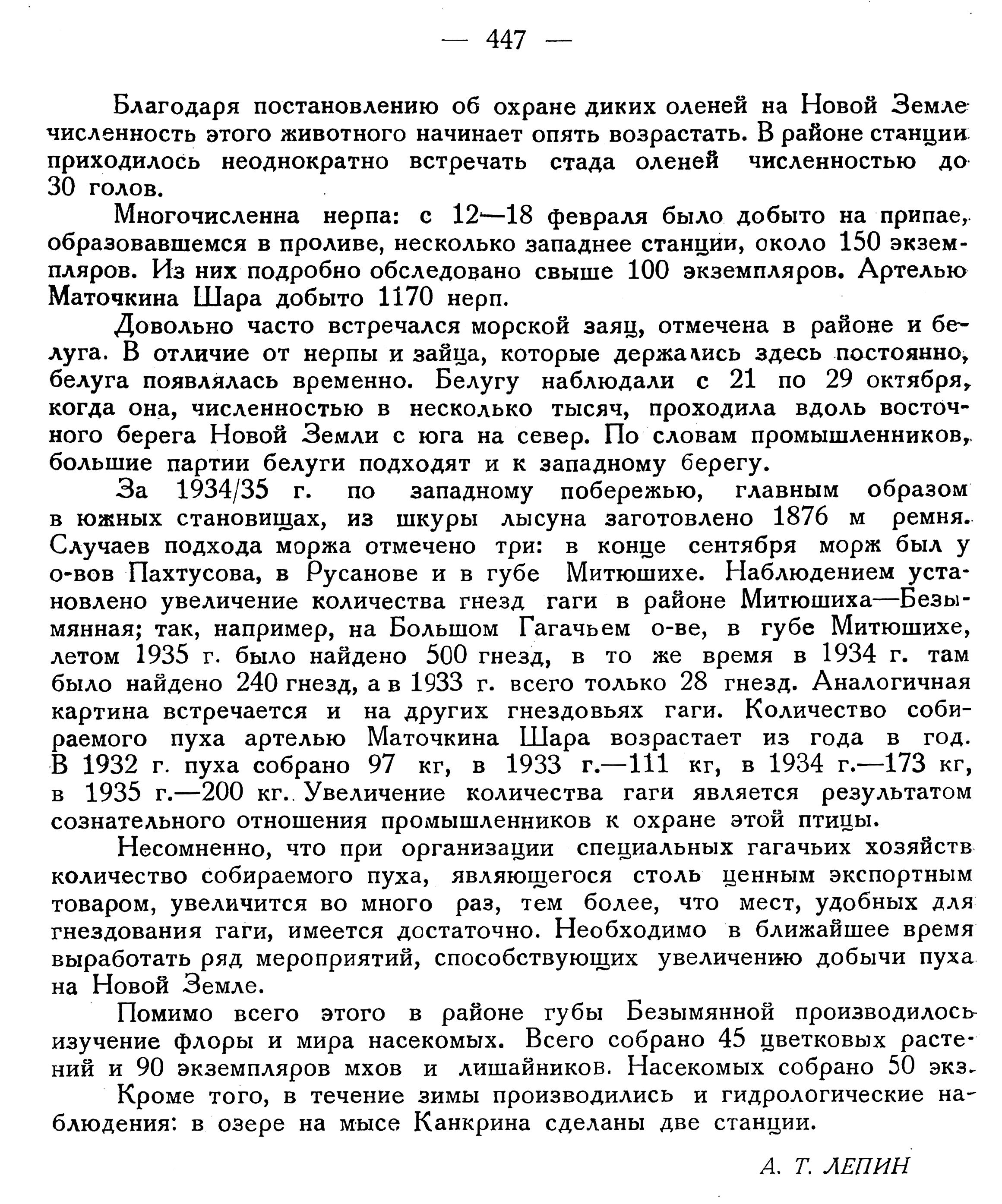 Зимовка биолога Всесоюзного Арктического института А. Т. Лепина на полярной станции Маточкин Шар длилась с 29 августа 1934 г. по 22 августа 1935 г. В основе программы биологических работ было изучение промысловой фауны. За время зимовки была проведена экскурсия в район мыса Канкрина. Кроме того, т. Лепиным посещались Белужья губа, южный берег пролива, мыс Выходной и др. районы.