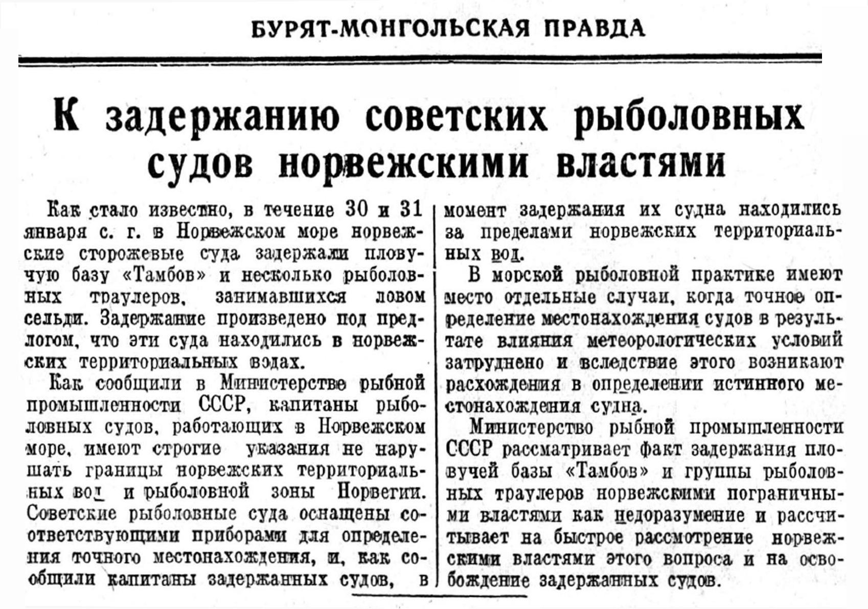 Как стало известно, в течение 30 и 31 января с. г. в Норвежском море норвежские сторожевые суда задержали пловучую базу «Тамбов» и несколько рыболовных траулеров, занимавшихся ловом сельди. Задержание произведено под предлогом, что эти суда находились в норвежских территориальных водах.