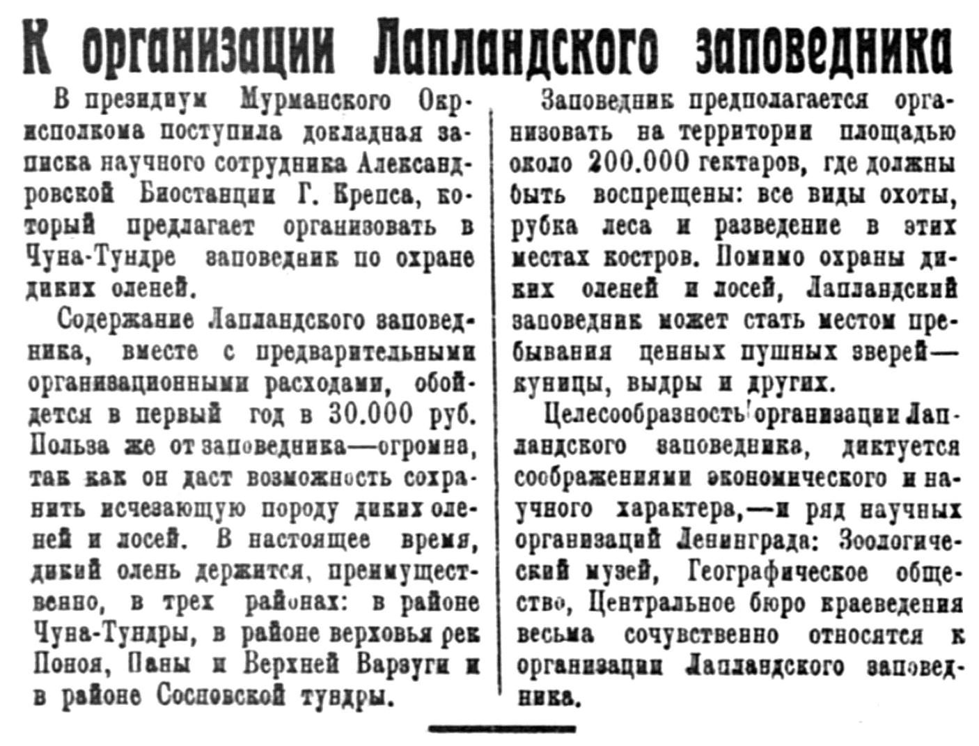 В президиум Мурманского Окрисполкома поступила докладная записка научного сотрудника Александровской Биостанции Г. Крепса, который предлагает организовать в Чуна-Тундре заповедник по охране диких оленей.