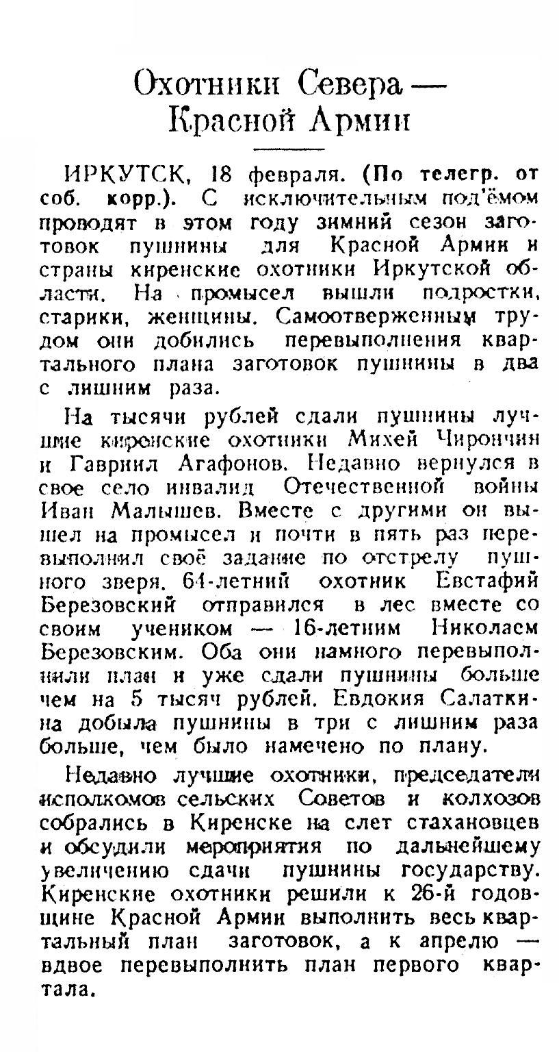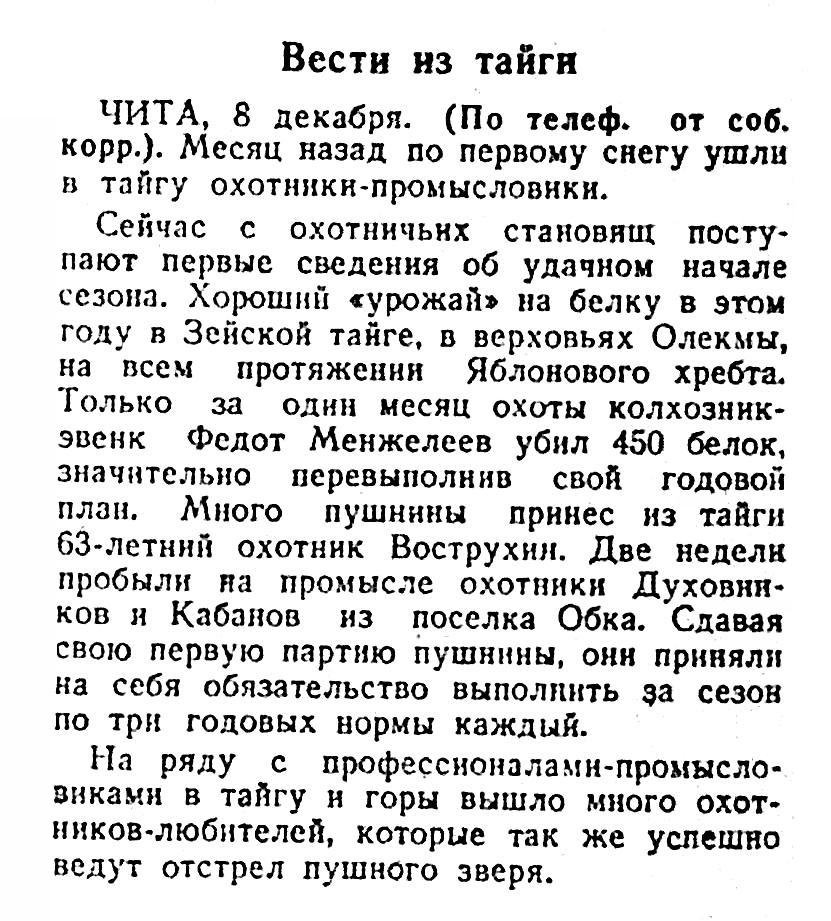 С первых дней среди возчиков развернулась борьба за быстрейшую доставку и полную сохранность грузов н оленей, занятых на перевозках. Первенство взял старый и опытный проводник-эвенк Татакан, в бригаде у которого 30 пар оленей. Но вскоре его обогнала в соревновании бригада эвенкийских девушек Маруси Михайловой. Выйдя впервые в самостоятельный рейс, 15 — 16-летние девушки-колхозницы за три дня прошли по тайге путь в 100 с лишним километров и доставили на 25 нартах 180 пудов груза.