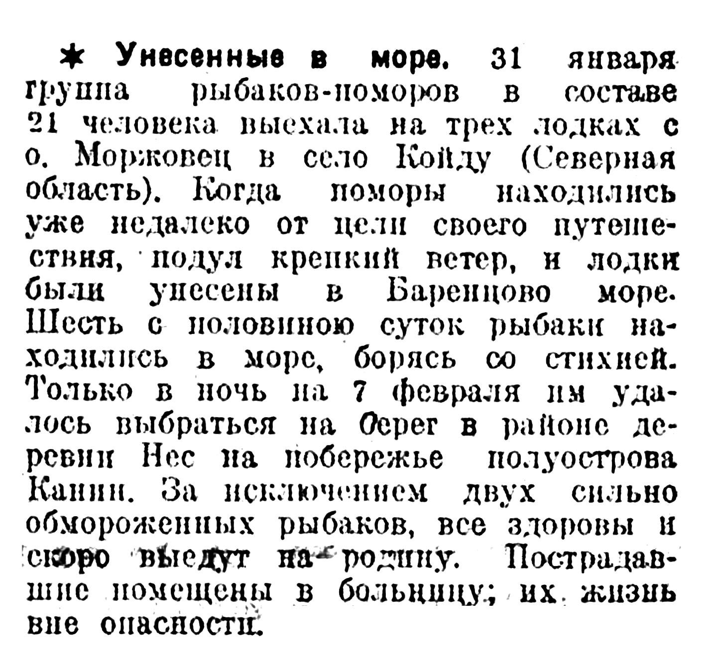 * Унесенные в море. 31 января группа рыбаков-поморов в составе 21 человека выехала на трех лодках с о. Моржовец в село Койду (Северная область). Когда поморы находились уже недалеко от цели своего путешествия, подул крепкий ветер, и лодки были унесены в Баренцово море. Шесть с половиною суток рыбаки находились в море, борясь со стихией. Только в ночь на 7 февраля им удалось выбраться на берег в районе деревни Несь на побережье полуострова Канин. За исключением двух сильно обмороженных рыбаков, все здоровы и скоро выедут на родину. Пострадавшие помещены в больницу; их жизнь вне опасности.