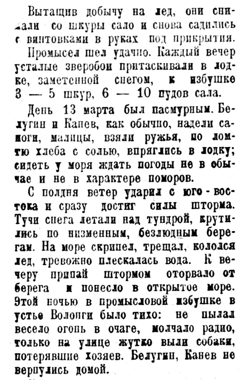 День 13 марта был пасмурным. Белугин и Канев, как обычно, надели сапоги, малицы, взяли ружья, по ломтю хлеба с солью, впряглись в лодку; сидеть у моря ждать погоды не в обычае и не в характере поморов.