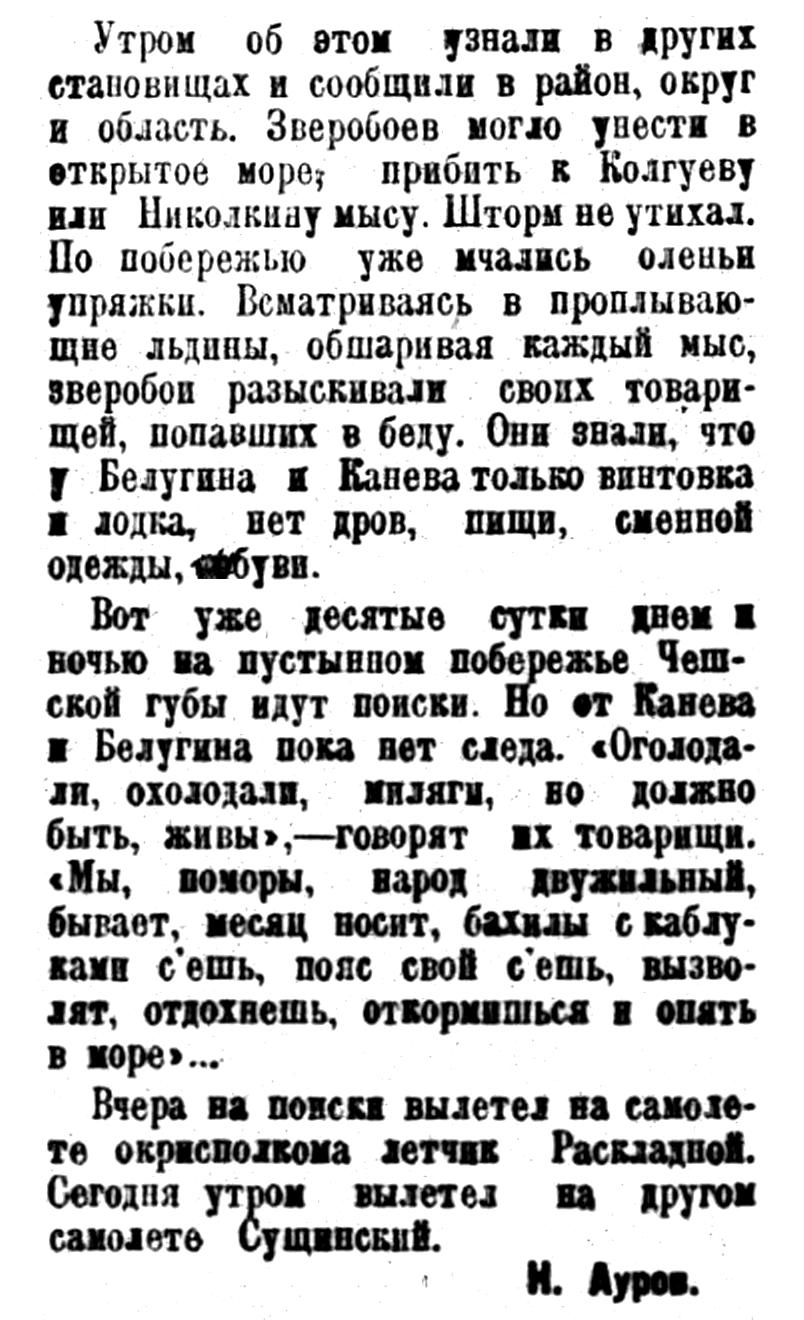 На розыски пропавших поморов сегодня днем вылетел самолет гражданской авиации под управлением пилота Клибанова и штурмана Захарова. Самолет пролетел от мыса Воронова через Койду до мыса Абрамова и отсюда до устья Мезени. На этом участке людей не обнаружено.