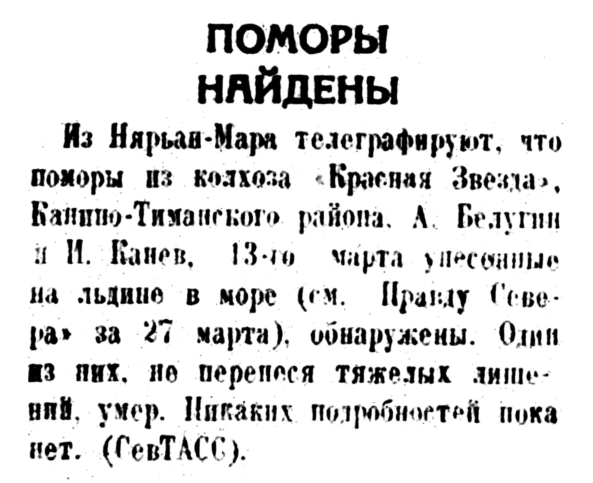 Из Нарьян-Мара телеграфируют, что поморы из колхоза "Красная Звезда", Канино-Тиманского района. А. Белугин и И. Канев. 13-го марта унесенные на льдине в море (см. "Правду Севера" за 27 марта), обнаружены. Один из них, не перенеся тяжелых лишений, умер. Никаких подробностей пока нет. (СевТАСС).