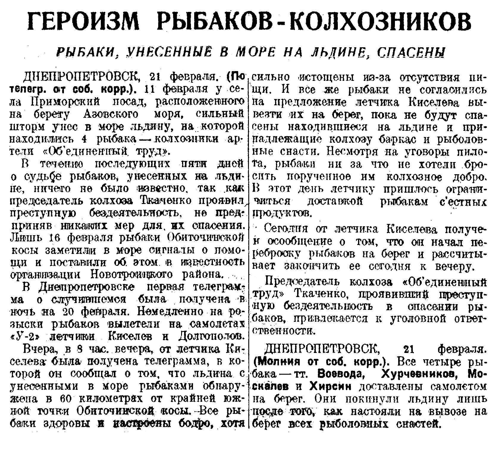 Вчера, в 8 час. вечера, от летчика Киселева была получена телеграмма, в которой он сообщал о том, что льдина с унесенными в море рыбаками обнаружена в 60 километрах от крайней южной точки Обиточинской косы. Все рыбаки здоровы и настроены бодро, хотя сильно истощены из-за отсутствия пищи. И все же рыбаки не согласились на предложение летчика Киселева вывезти их на берег, пока не будут спасены находившиеся на льдине и принадлежащие колхозу баркас и рыболовные снасти. Несмотря на уговоры пилота, рыбаки ни за что не хотели бросить порученное им колхозное добро. В этот день летчику пришлось ограничиться доставкой рыбакам съестных продуктов.