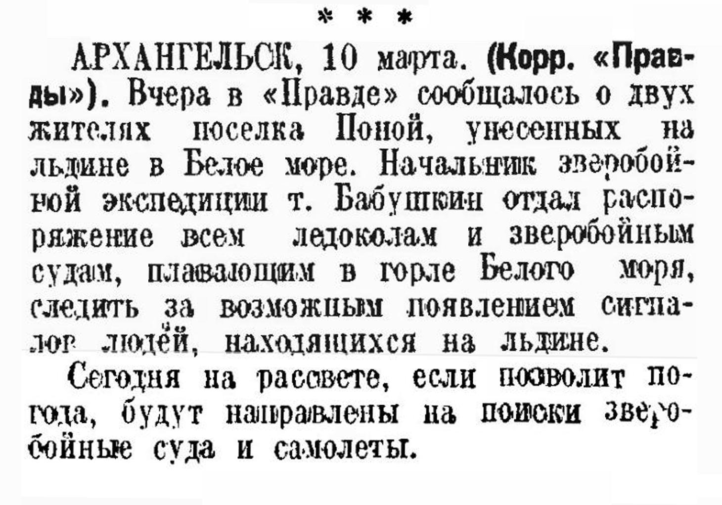 АРХАНГЕЛЬСК» 10 марта. (Корр. «Правды»), Вчера в «Правде» сообщалось о двух жителях поселка Поной, унесенных на льдине в Белое море. Начальник зверобойной экспедиции т. Бабушкин отдал распоряжение всем ледоколам и зверобойным судам, плавающим в горле Белого моря, следить за возможным появлением сигналов людей, находящихся на льдине.