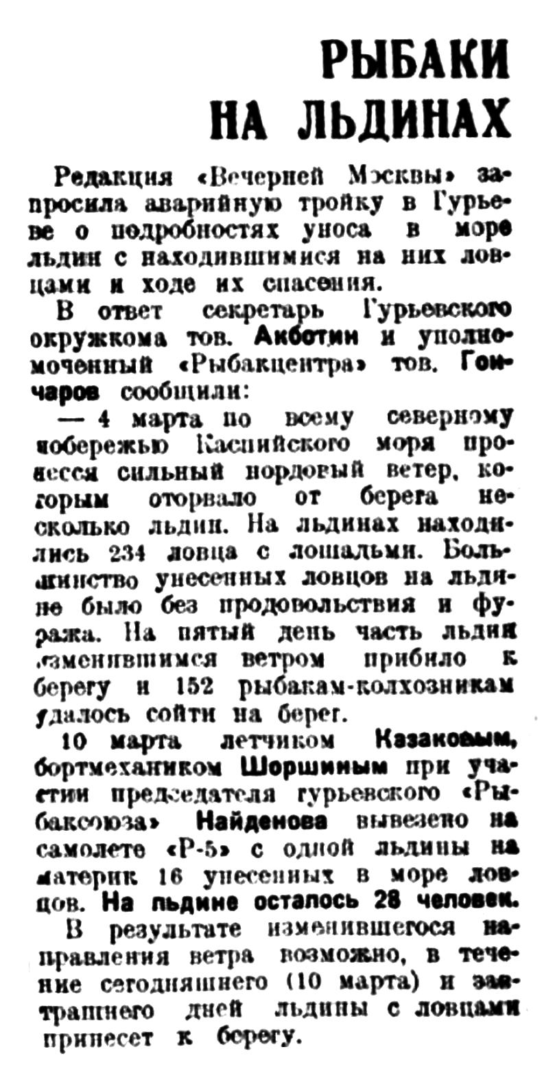 10 марта летчиком Казаковым, бортмехаником Шоршиным при участии председателя гурьевского «Рыбаксоюза» Найденова вывезено на самолете «Р-5» с одной льдины на материк 16 унесенных в море ловцов. На льдине осталось 28 человек.