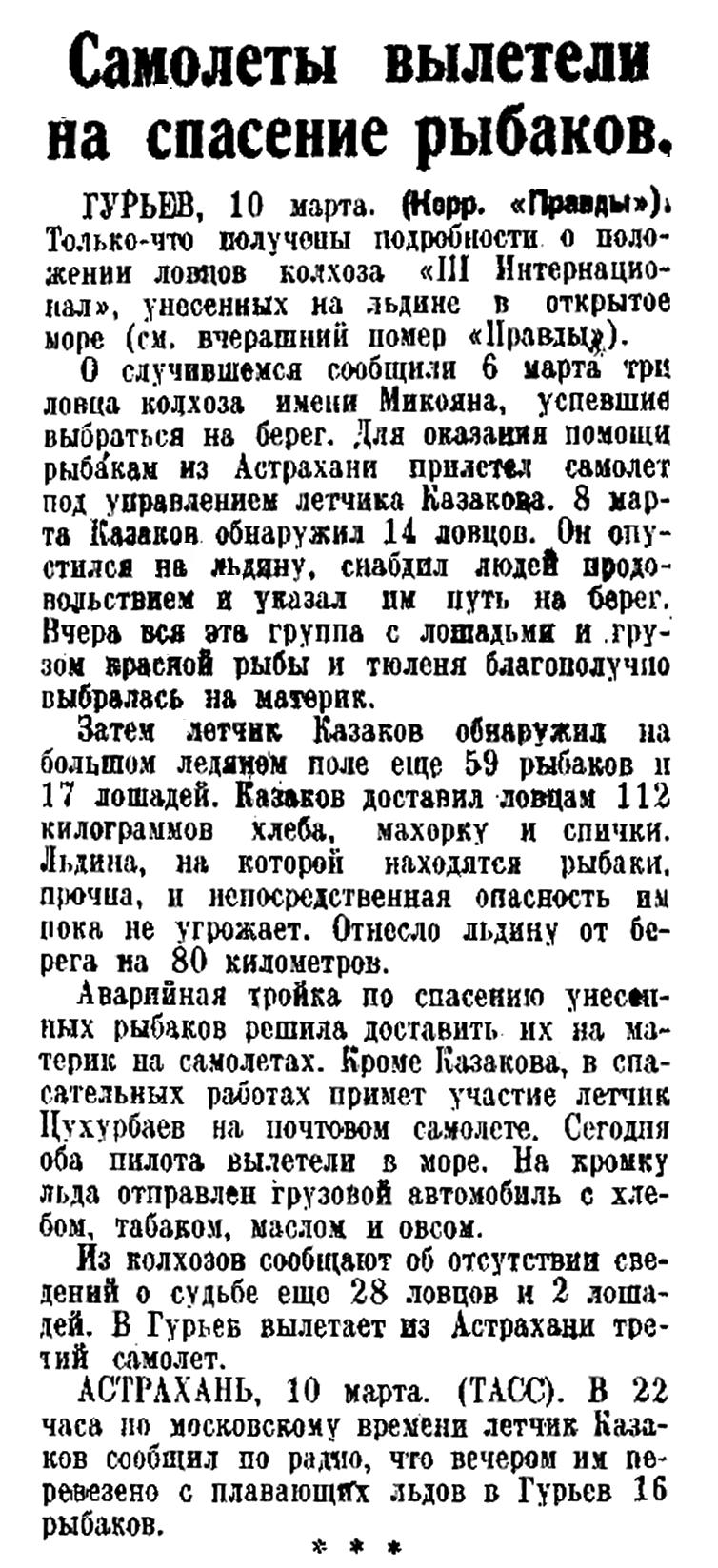 АСТРАХАНЬ. 10 март». (Молния от соб. корр.). Сегодня вечером летчик Козлов перебросил на материк 16 рыбаков. Переброска остальных рыбаков завтра будет продолжена. Погода вполне благоприятствует полетам. Устроенная рыбаками площадка для посадки самолета находится в хорошем состоянии.