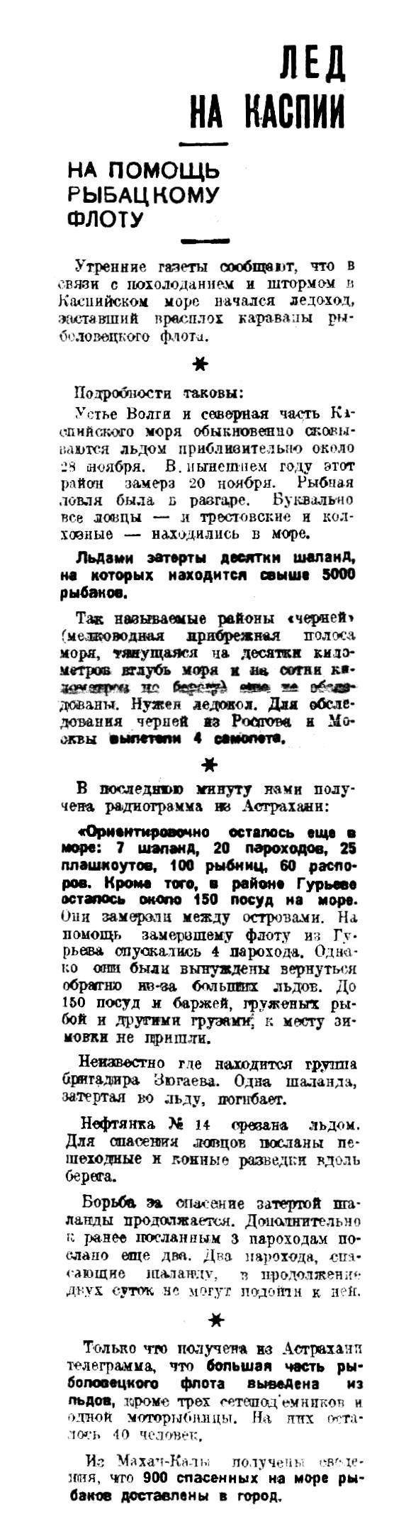 Затертые во льдах Каспийского моря рыбаки спасены. Из 5,200 рыбаков погибло 7. Спасенные доставлены в Махач-Калу и на промыслы треста Дагрыба (остров Чемкент), Отсюда отдельными партиями они направляются по домам.