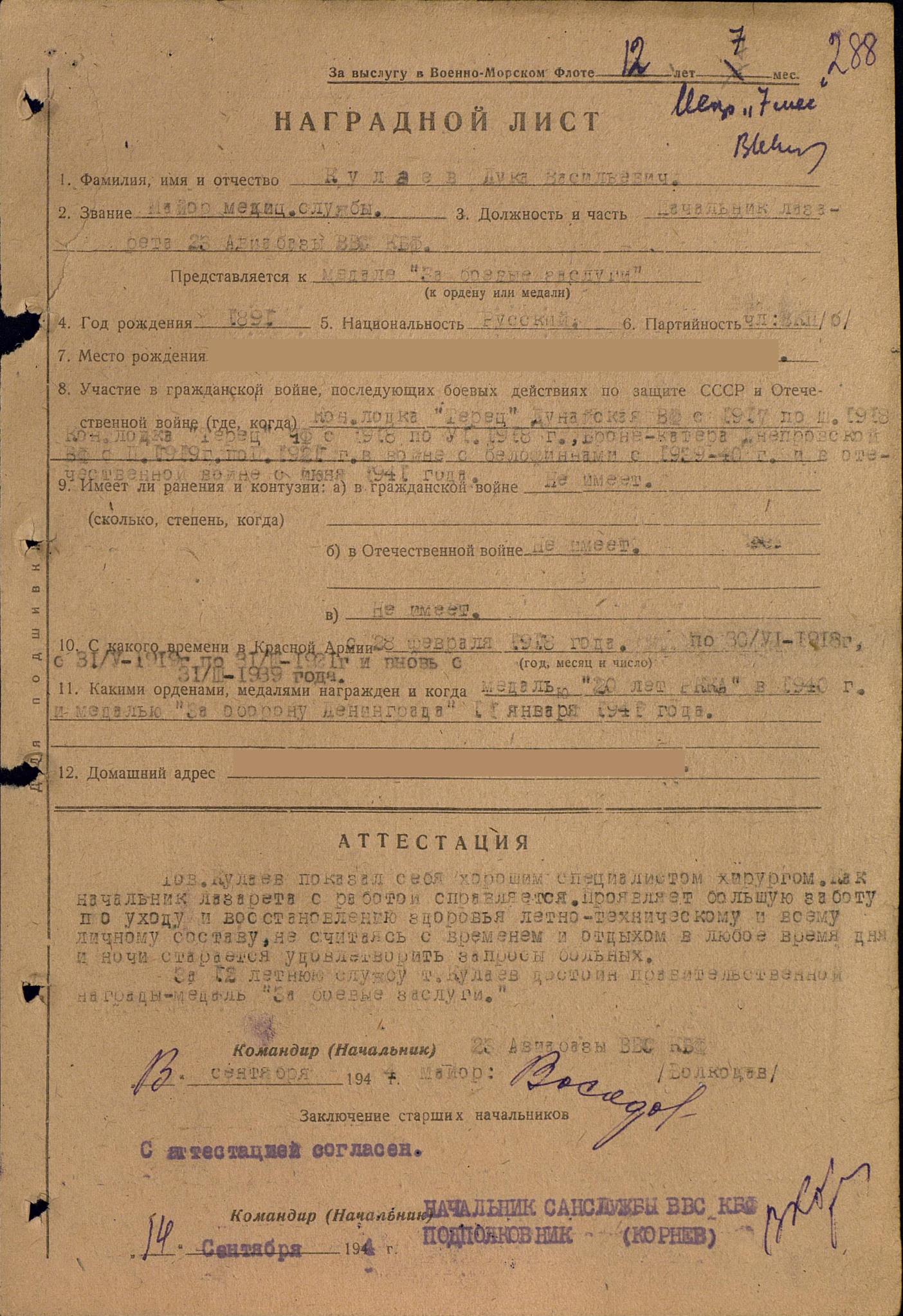 Представление на награждение № 92 от: 16.10.1945 ВВС КБФ