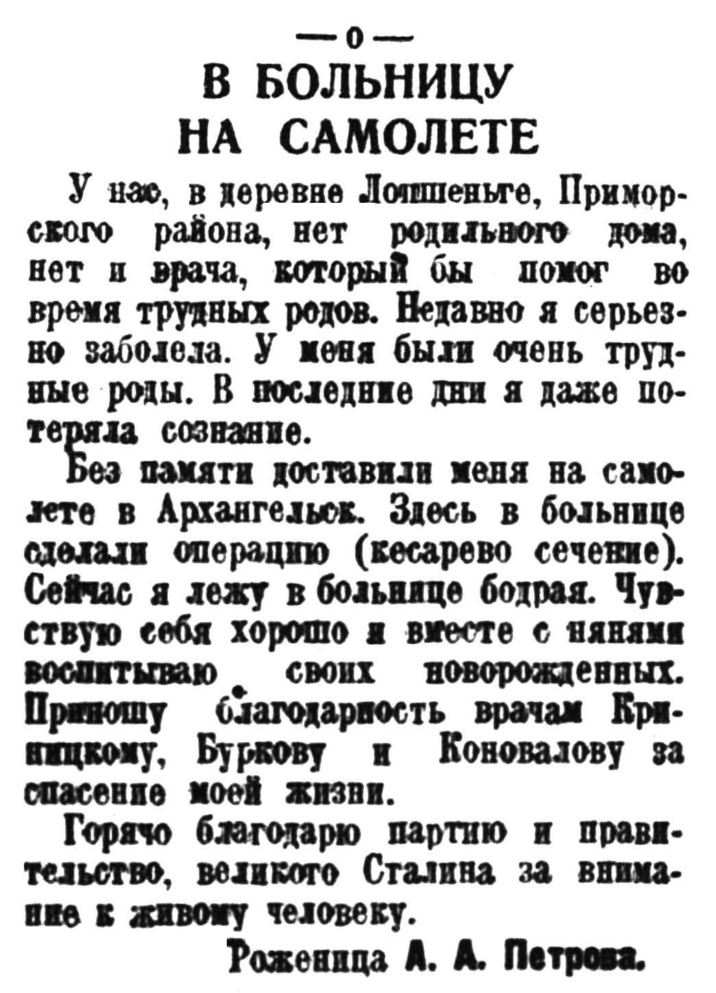 13 февраля 1929 г. самолет "Ю-13" под управлением летчика И. В. Михеева, нынешнего командира "АНТ-14" вылетел из Москвы и на другой день был в Пудоже. 15 февраля Громцева лежала на операционном столе в одной из клиник Ленинграда. Ее жизнь была спасена. Спасена самолетом.