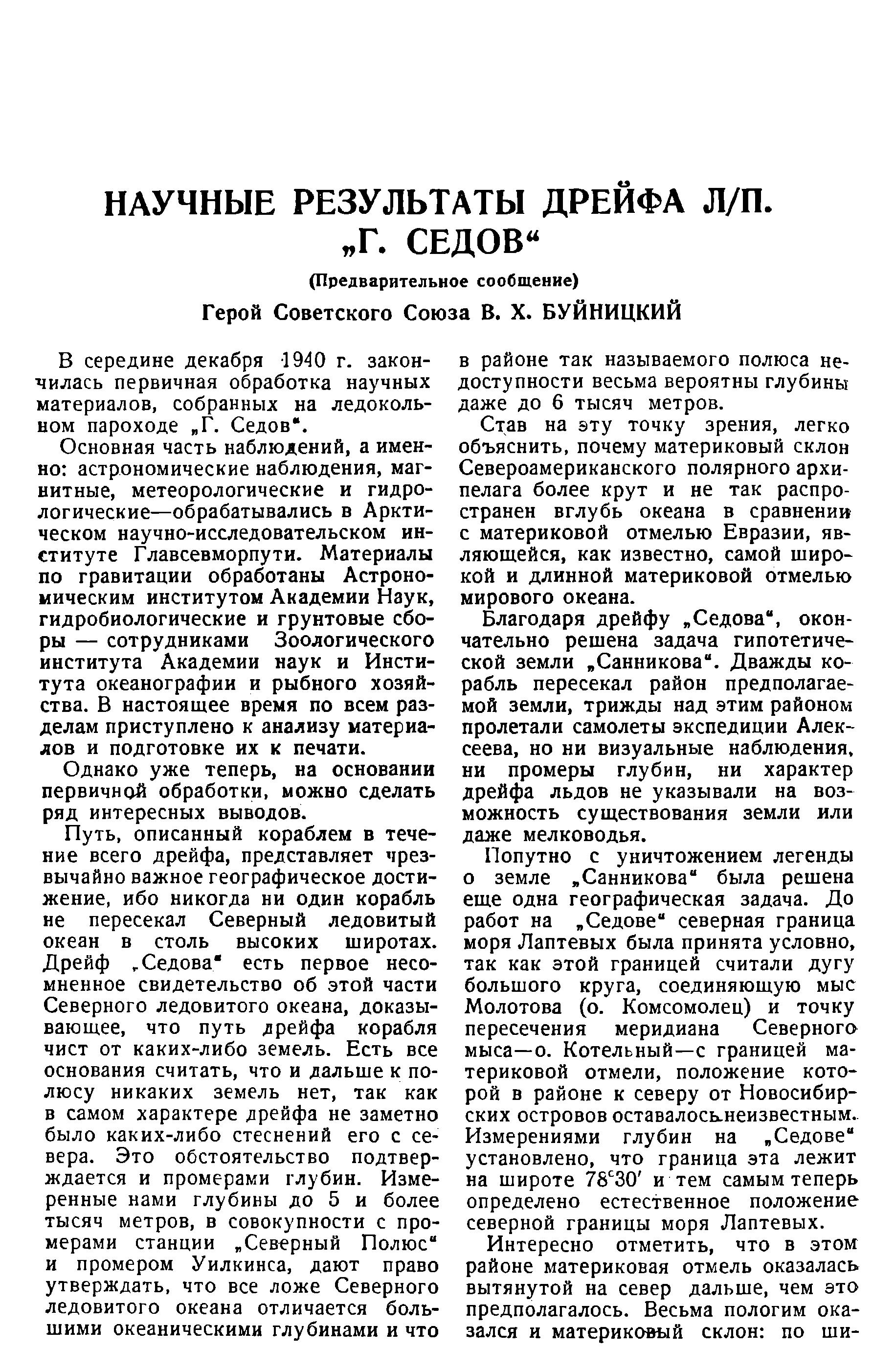 16 февраля 1940 года студент пятого курса Гидрографического института Главсевморпути Виктор Буйницкий доложил об исследованиях седовцев на специально созванном расширенном заседании президиума Академии наук СССР. Рассказал он о работе в тех широтах, где еще никогда не бывали люди. Сам он вел наблюдение за полярными сияниями, за льдом, за животными и птицами, участвовал в промерах глубин и метеорологических наблюдениях... Люди такой широты знаний - большая редкость. Вот почему его пришли послушать академики. Эту работу студента опубликовали в «Докладах Академии наук СССР»!