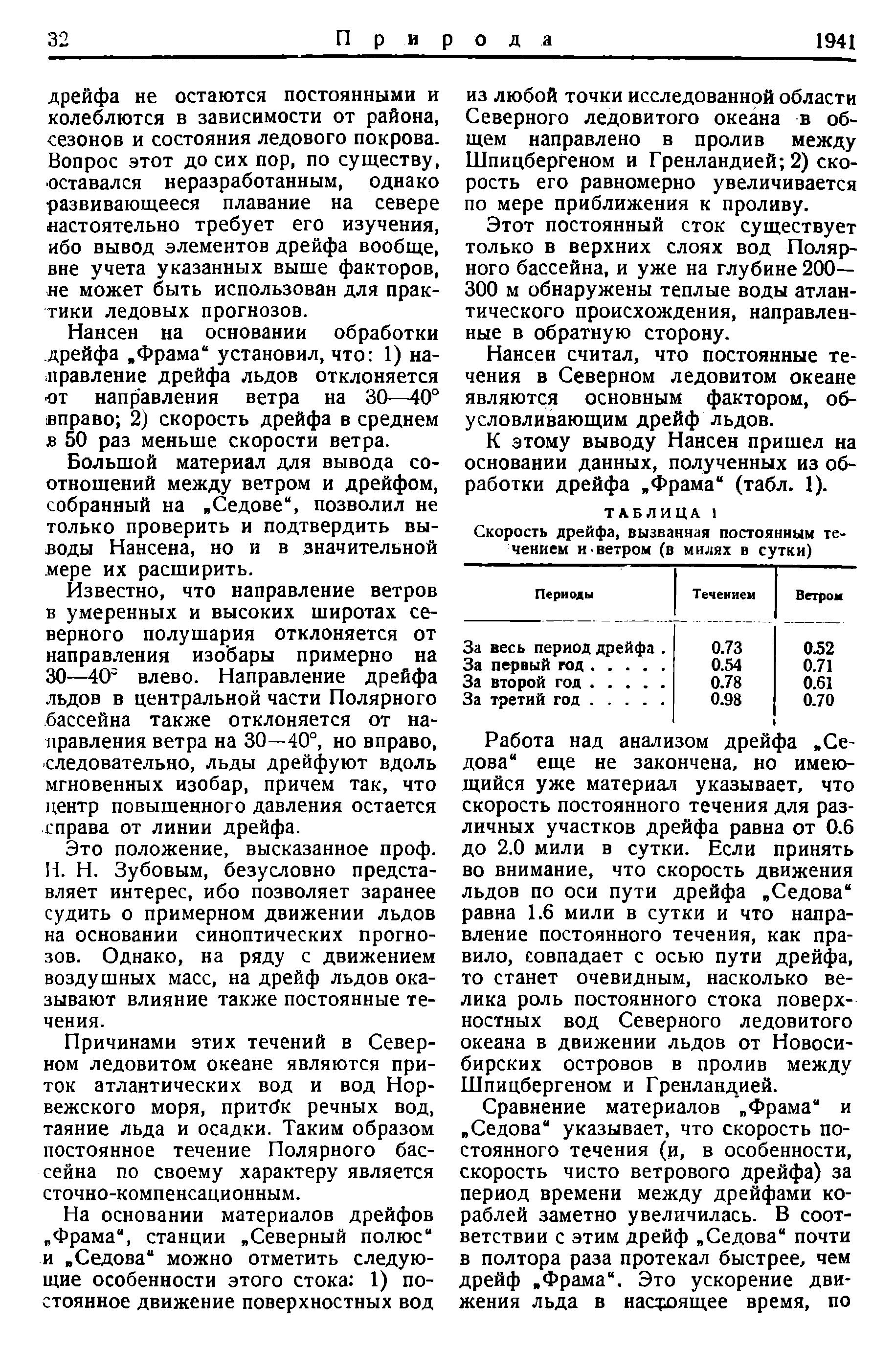 К этому выводу Нансен пришел на основании данных, полученных из обработки дрейфа «Фрама» (табл. 1).
