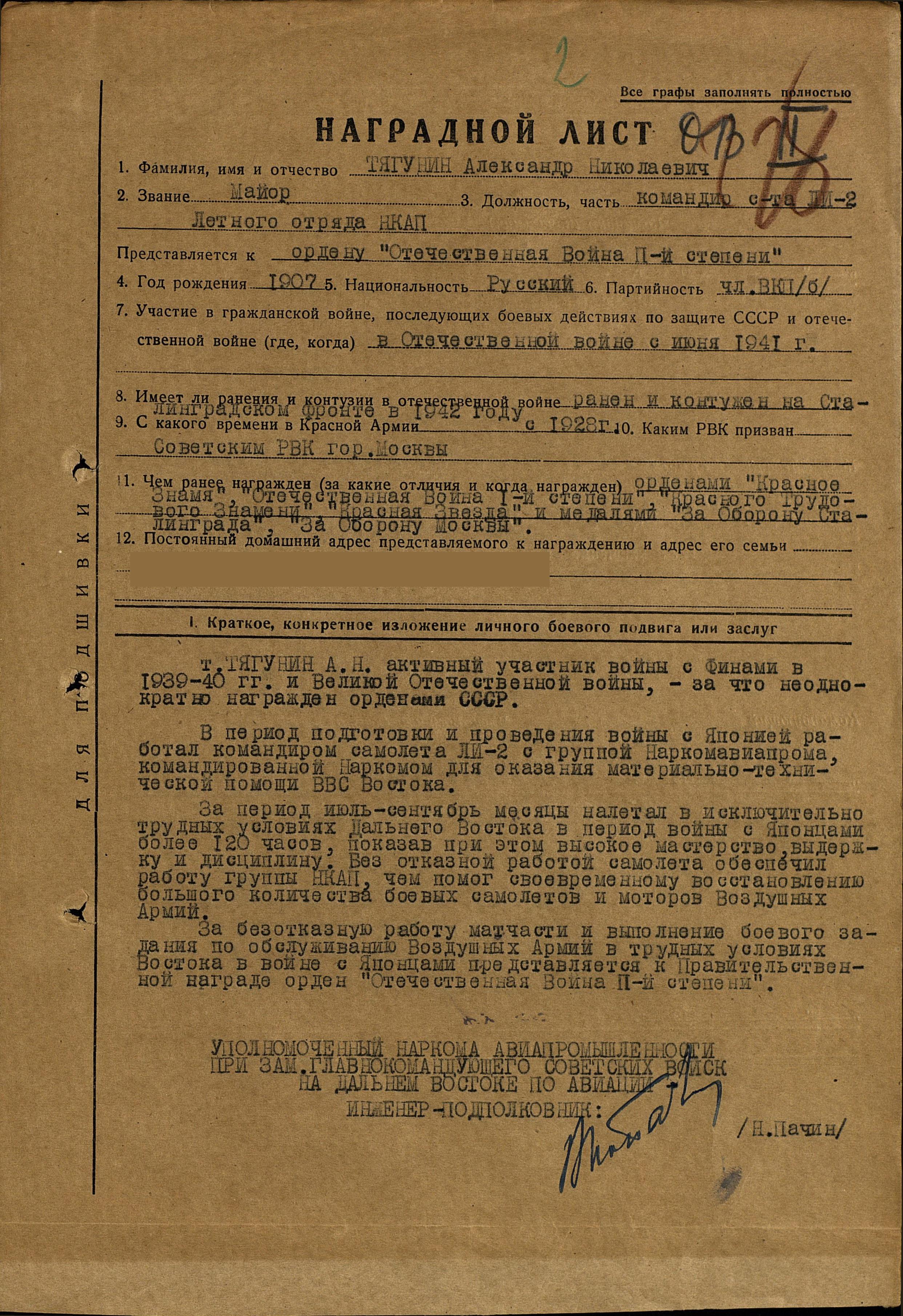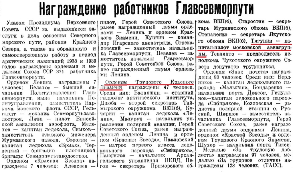 Это была поистине труднейшая работа. Летчики выполнили ее мастерски. Отрядом командовал Герой Советского Союза Анатолий Дмитриевич Алексеев. За выполнение этого задания А. Н. Тягунин был награжден орденом Трудового Красного Знамени. Он много и успешно летал в полярной авиации, участвовал в Великой Отечественной войне, гордо и с честью пронес через всю свою большую летную жизнь славу одного из лучших в стране мастеров слепого полета.