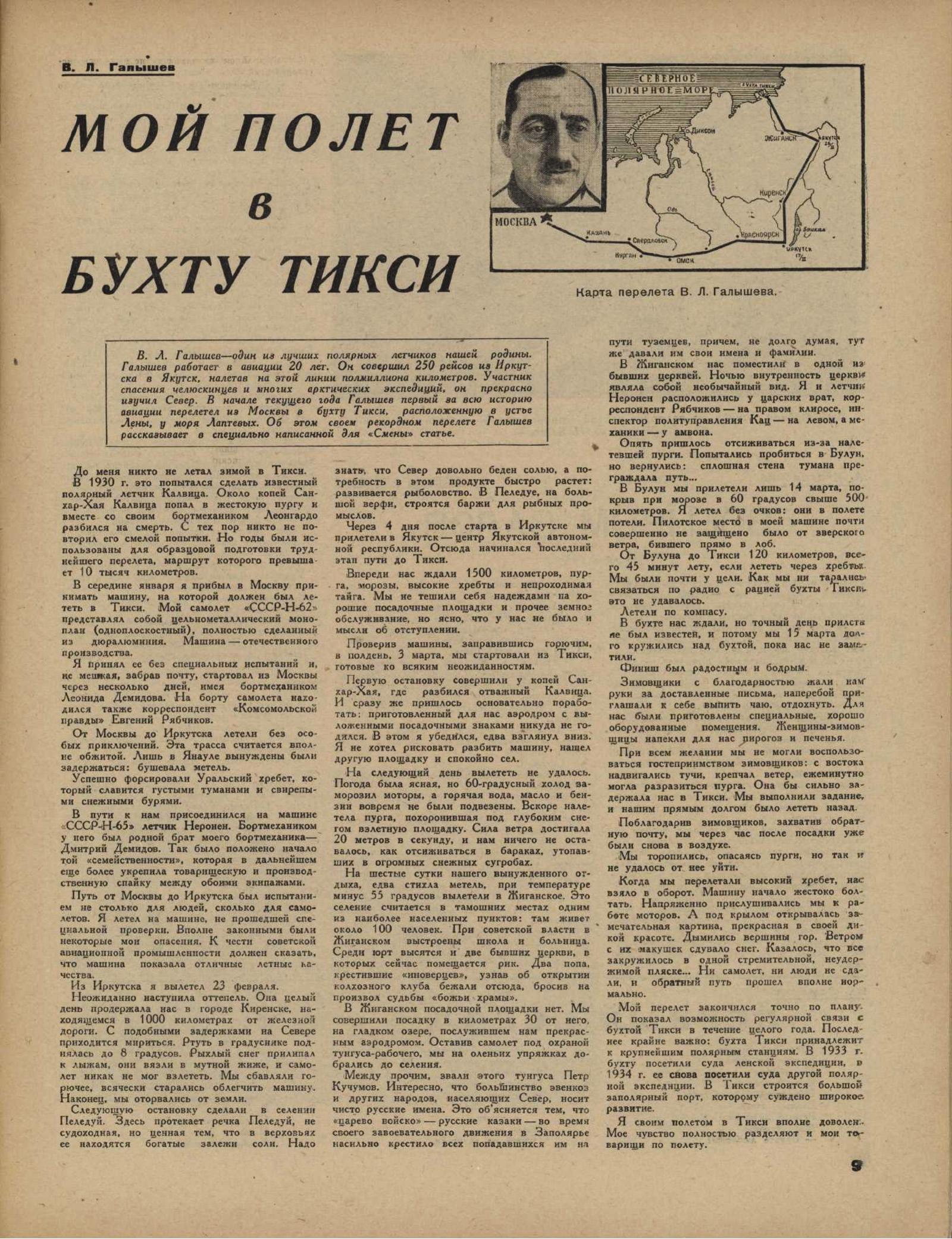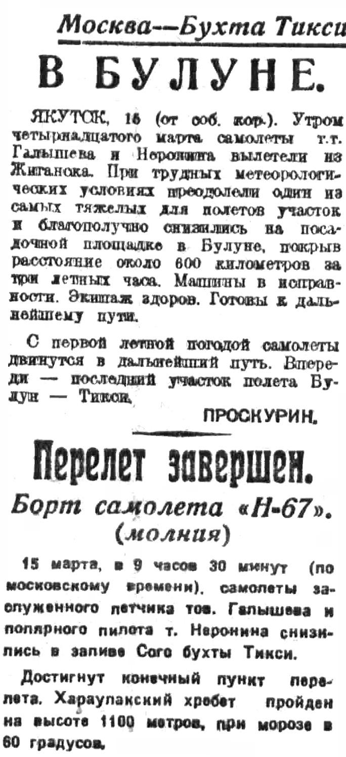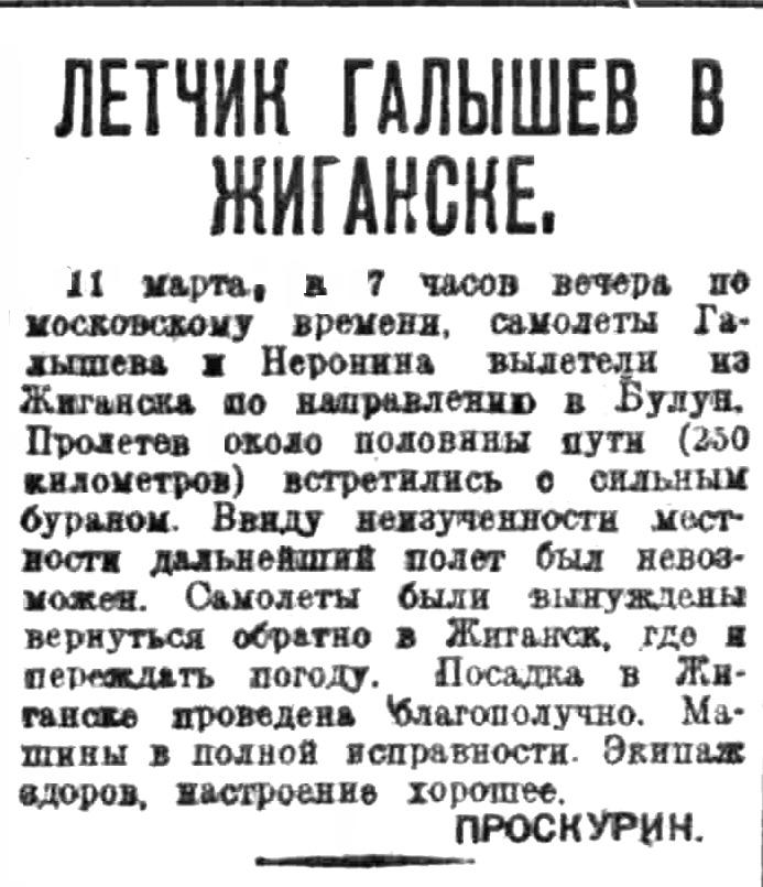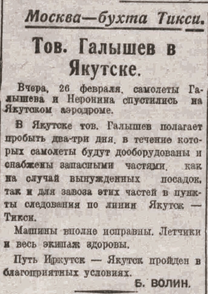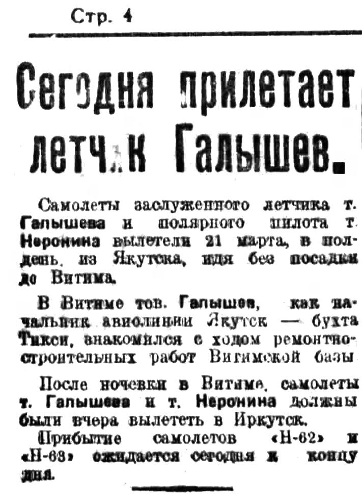 «... К десятилетнему юбилею Автономной Якутской Советской Социалистической Республики, как лучших ударников, за лучшие показатели работы…, за регулярность полетов, за отсутствие аварийности премировать Почетной грамотой и мехами следующих товарищей Гражданского Воздушного Флота линии Якутск – Иркутск: Галышева Виктора Львовича – краснознаменца, воздушного классного пилота самолета Л-32 (номер самолета), совершившего перелет на линии Якутск – Иркутск в навигацию 1932 года…, премировать Почетной грамотой и мехом на пальто на сумму 800 рублей (самая крупная сумма среди восьми награжденных авиаторов – А.Ф.)»