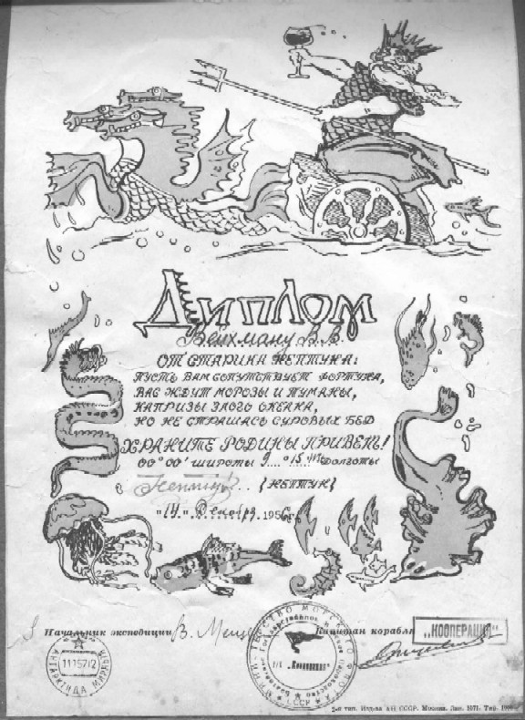 В первый раз я пересек экватор 14 декабря 1956 года на теплоходе "Кооперация". По традиции, заведенной Крузенштерном, это событие было отмечено веселым праздником Нептуна, в написании сценария которого я принял немалое участие. Капитан Анатолий Савельевич Янцелевич отдал рапорт морскому царю, а морские черти побросали всех членов экипажа в соленую купель. Я тоже был морским чертом - на фотографии второй справа.