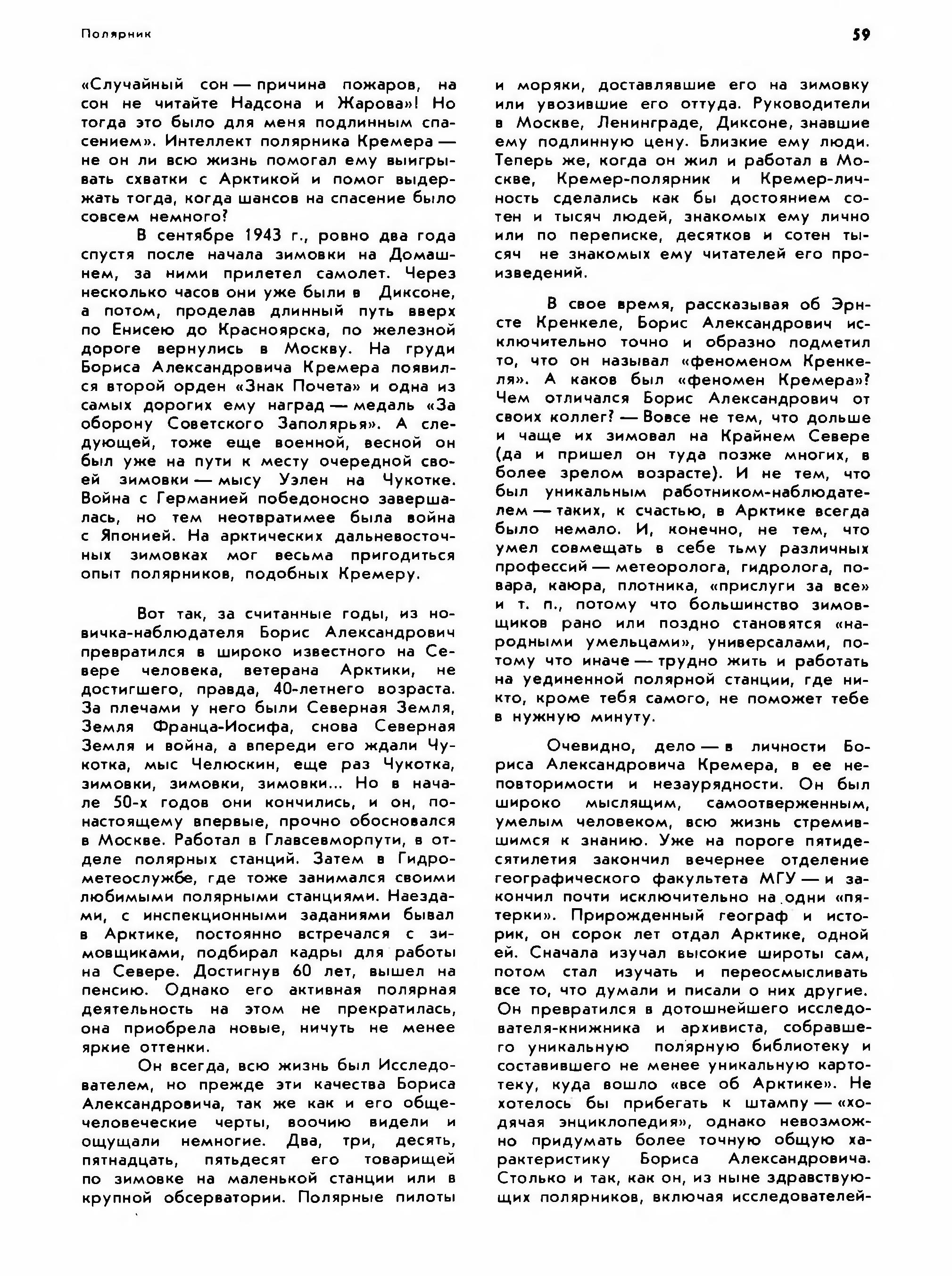 ... Иногда мы вдруг начинаем стесняться слов. Таких, например, как «романтика», «подвиг». В какой-то мере, естественно, потому, что они становятся затасканными, из гордых превращаются в громкие. Наша «щедрость» время от времени делается непомерной, словом «подвиг», в частности, мы готовы бываем одарить чуть ли не любого мастера спорта по прыжкам, в длину или в высоту... Но сейчас хочется произнести высокие слова в полный голос: полярник Кремер заслужил их всей своей жизнью, столь преждевременно оборвавшейся.