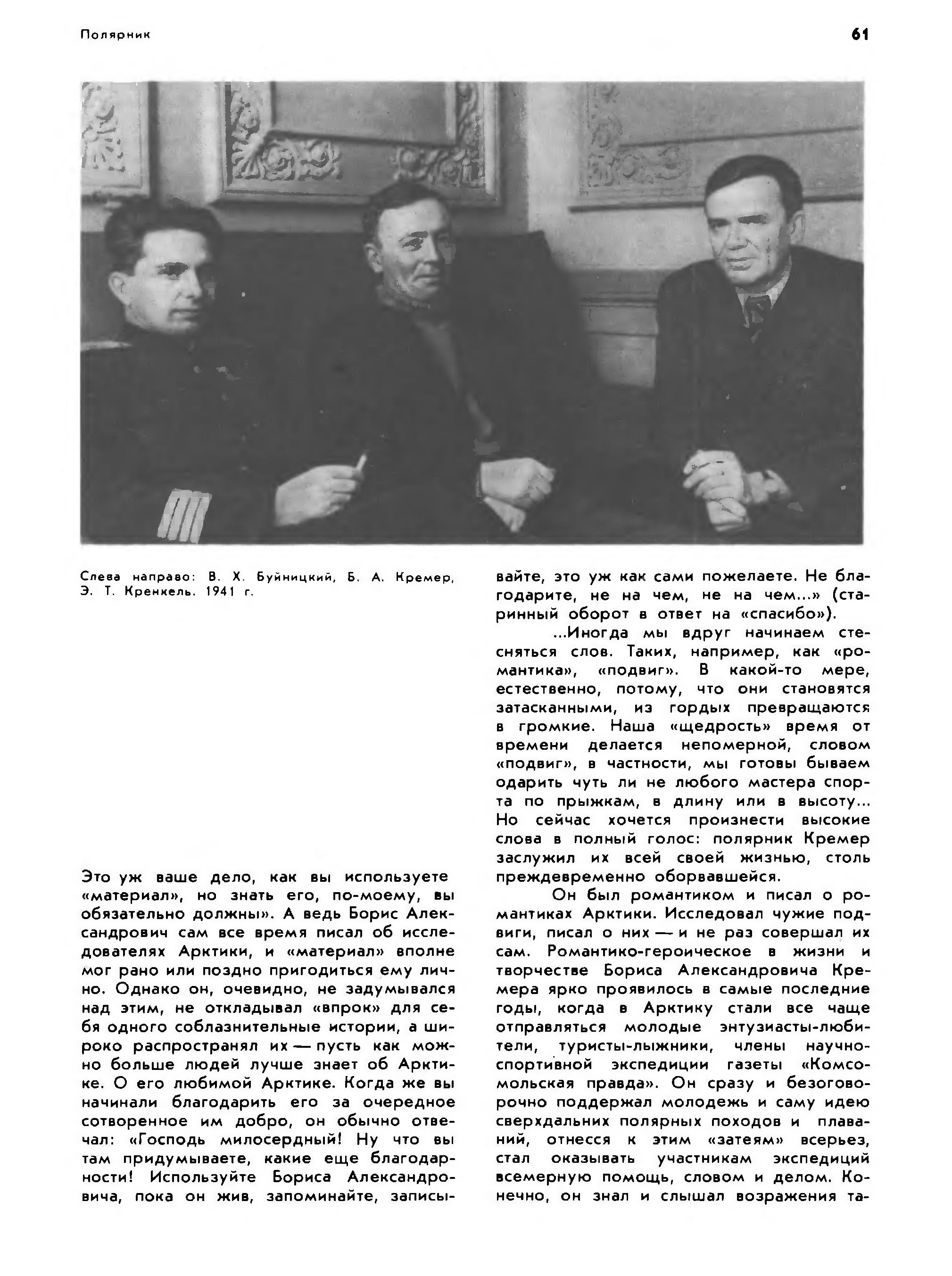 и моряки, доставлявшие его на зимовку или увозившие его оттуда. Руководители в Москве, Ленинграде, Диксоне, знавшие ему подлинную цену. Близкие ему люди. Теперь же, когда он жил и работал в Москве, Кремер-полярник и Кремер-личность сделались как бы достоянием сотен и тысяч людей, знакомых ему лично или по переписке, десятков и сотен тысяч не знакомых ему читателей его произведений.