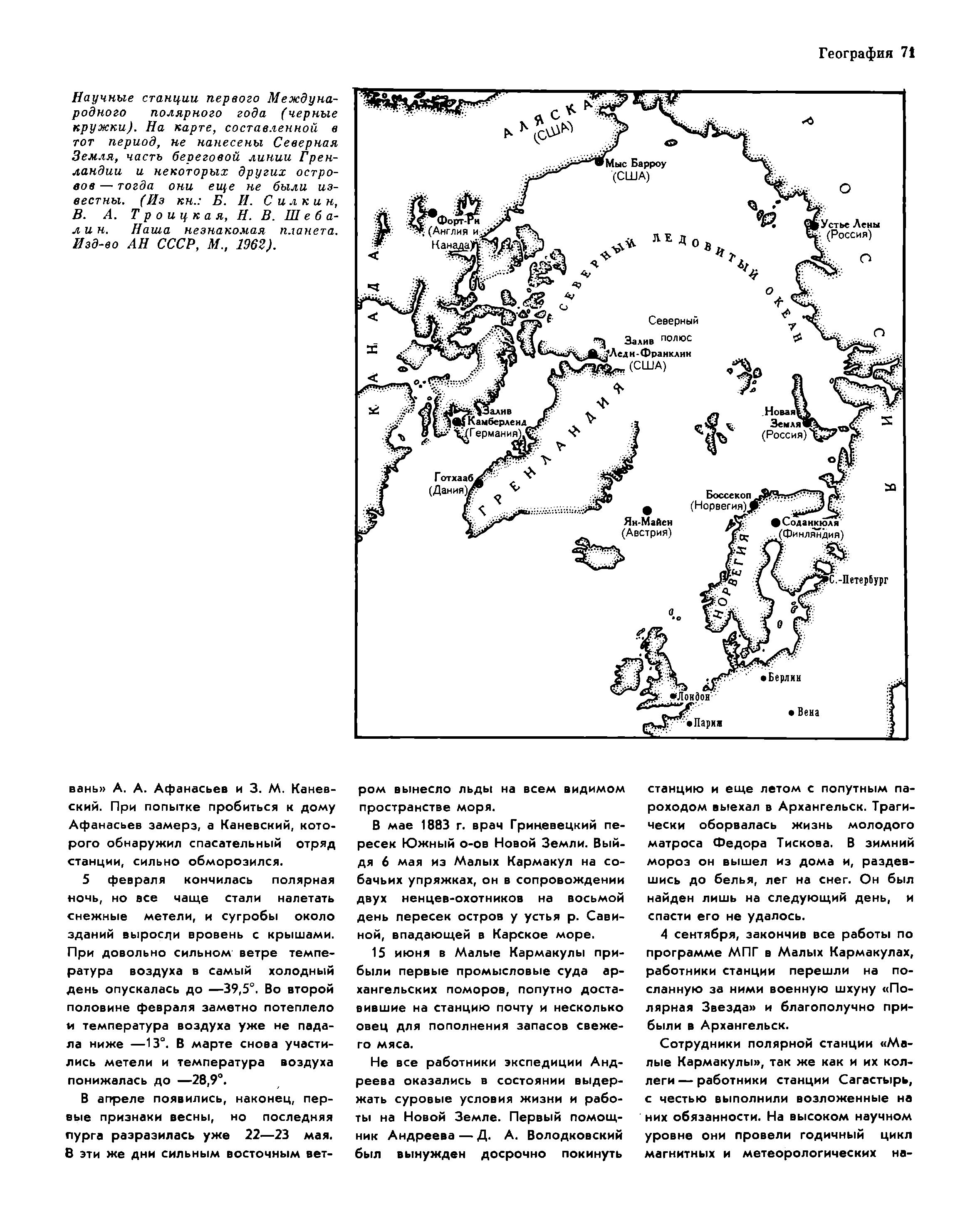 [i]Научные станции первого Международного полярного года (черные кружки). На карте, составленной в тот период, не нанесены Северная Земля, часть береговой линии Гренландии и некоторых других островов — тогда они еще не были известны. (Из кн.: Б. И. Силкин, В. А. Троицкая, Н. В. Шебалин. Наша незнакомая планета. Иэд-во АН СССР, М., 1962).[/i] : Кремер.Первые полярные станции - 0008.jpg