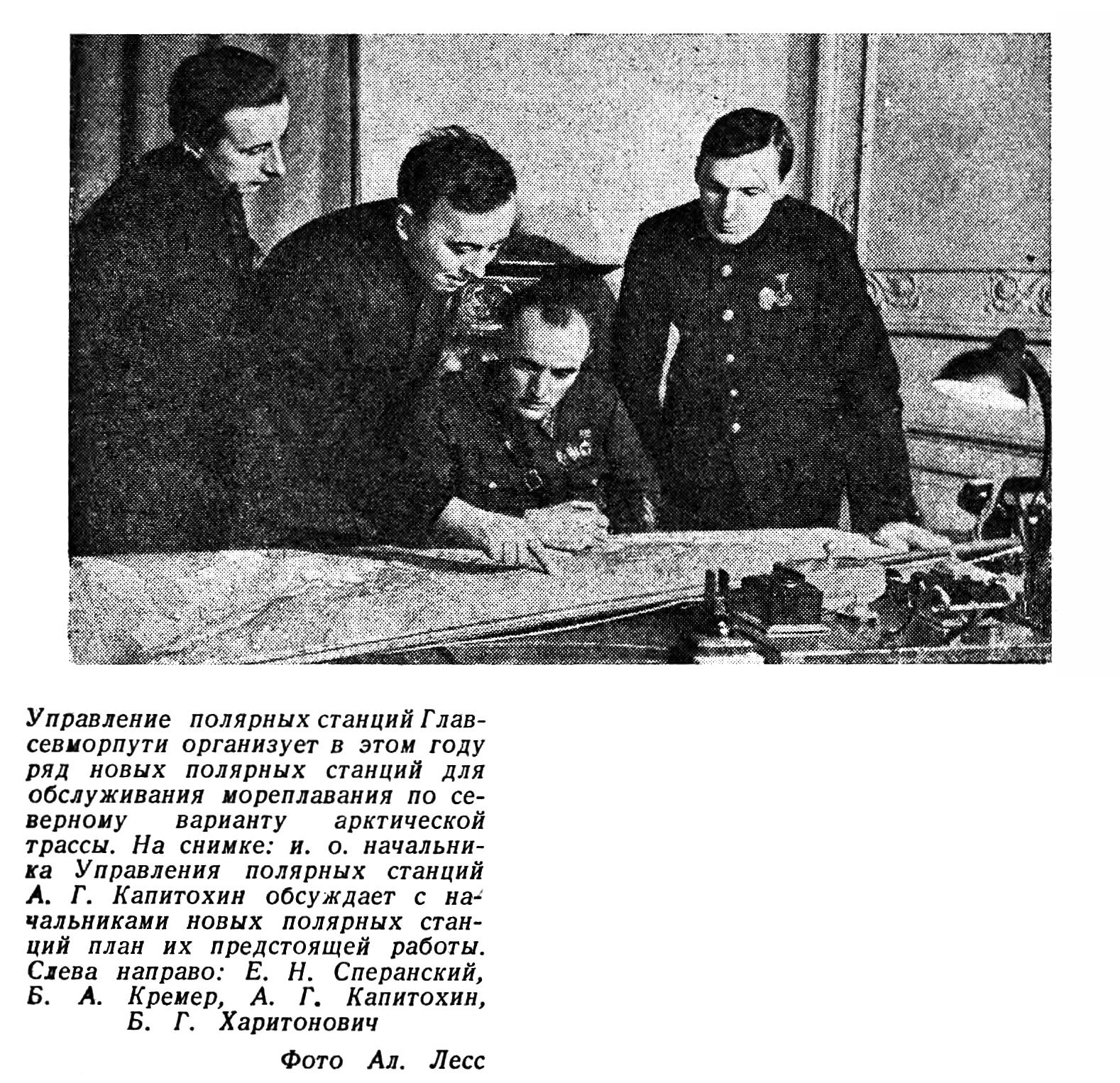 Управление полярных станций Главсевморпути организует в этом году ряд новых полярных станций для обслуживания мореплавания по северному варианту арктической трассы. На снимке: и. о. начальника Управления полярных станций А. Г. Капитохин обсуждает с начальниками новых полярных станций план их предстоящей работы. Слева направо: Е. Н. Сперанский, Б. А. Кремер, А. Г. Капитохин, Б. Г. Харитонович